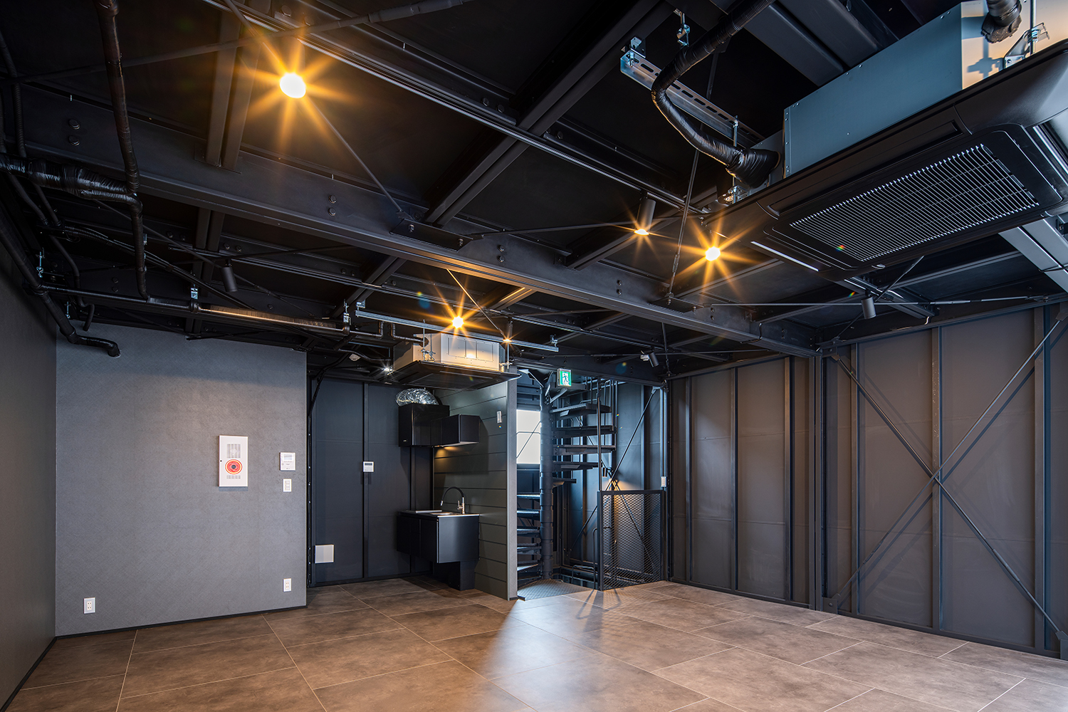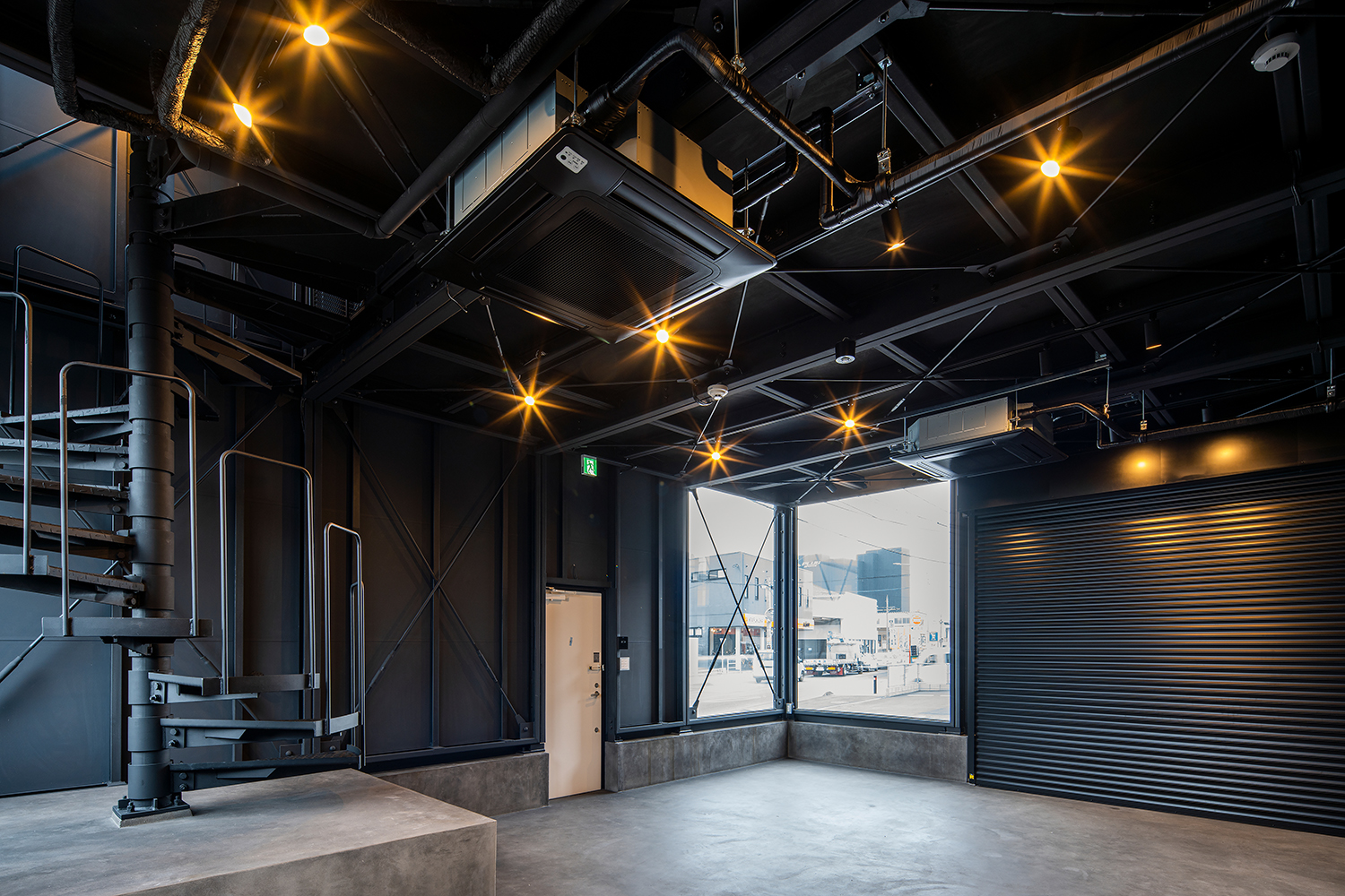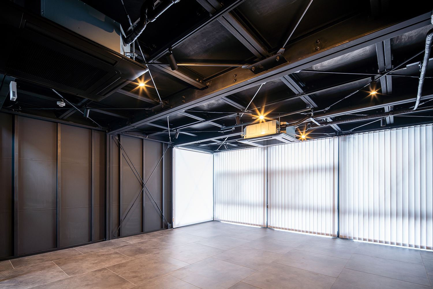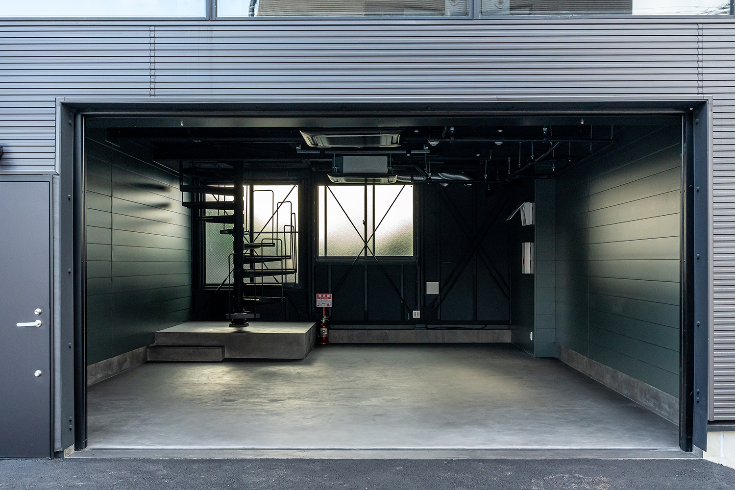 1階ガレージは、クルマが2台余裕で保管できる広さとなっています。2階には、トイレが設置されているのでショールームやアトリエなどに最適です。C棟は1階の室内ガレージの他、敷地内に2台分の駐車が可能(無料)なので来客対応も心配無用。また、敷地前のスペースも十分な広さがあるので車の出し入れもストレスフリー。通り沿いの3号室のみ他の居室と異なり、通り面はガラス開口となっています。そのためガレージの入口が狭くなっていますが、明るさがあるので開放的な空間に仕上がっています。