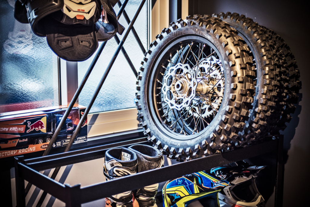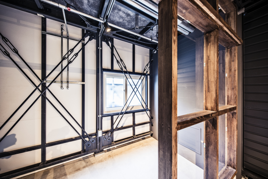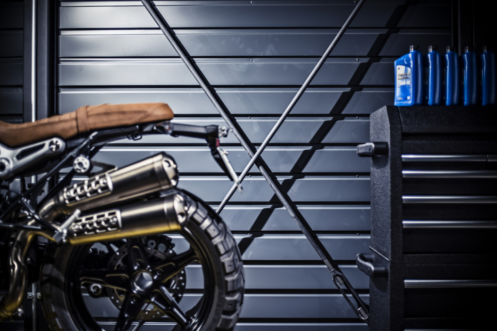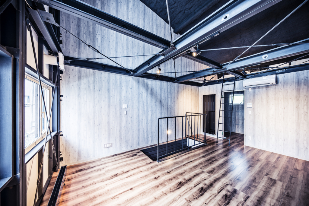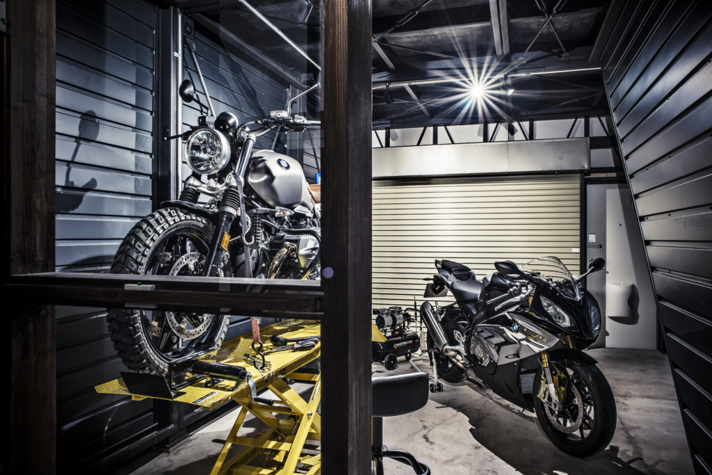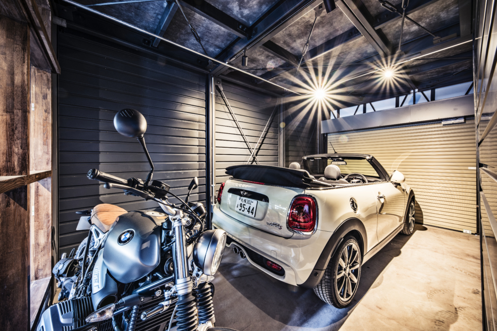 従来のガレージアパートは法律の制限と予算の関係で、そのほとんどがビニールクロスの仕様になっています。しかし、それでは愛着のあるクルマやバイクの格納庫としては、いかにも線が細い、単にクルマ&バイクの置き場にすぎません。デイトナハウス仕様は、ガレージの壁面がガルバリウム鉄板製。磁石を使って工具を吊るすもよし、かっこいいポスターを吊るすもよし。艶消し黒の鉄骨フレームとの相乗効果で、ワイルドで飽きのこないガレージ空間が出現します。