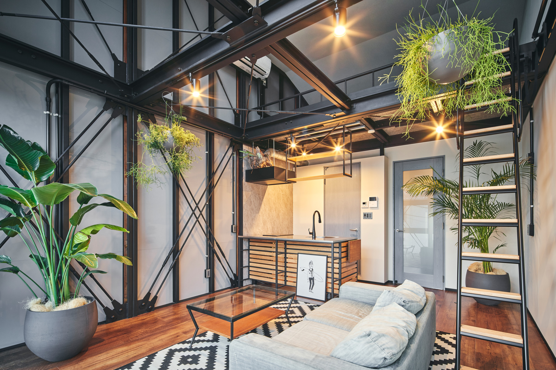 標準タイプでも高さ5メートルの吹き抜けを備えた12畳のリビングキッチンと8畳のロフトがあり、開放感溢れる空間を演出しています。ロフトへ登るハシゴは収納式で、必要な時だけ引き出して使用できる機能的な設計です。