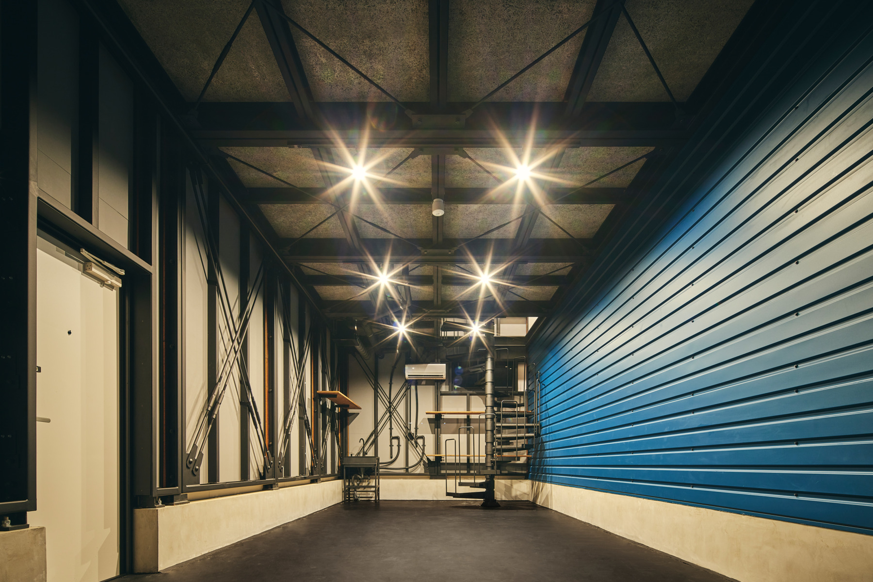 THE BASE NOBORITOは、2×4スパンが3戸、2×4.5スパンが2戸の計5戸で構成され、1階は玄関扉を最小限に抑え、シャッター開口を優先した大胆な間取りを採用しています。また、そのうちの1戸は、玄関ドアを脇に配置し、正面を全面シャッターにすることで更なる大開口を実現しています。