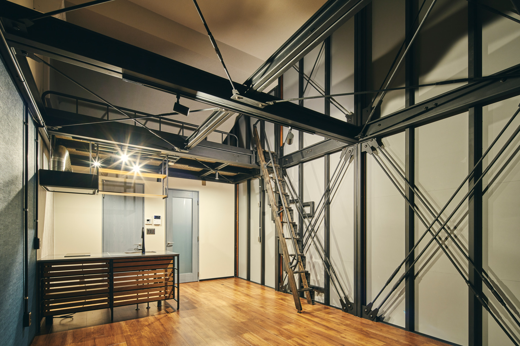 2階の居室スペースは、ワンルーム+ロフトのコンセプトで構成。空間を最大限に活用するため、カウンター付きのオープンキッチンを採用。ファミリー層ではなく、新しいライフスタイルを求める単身層をターゲットにしているため、あえてシャワーブースのみとしているのも特徴的です。
