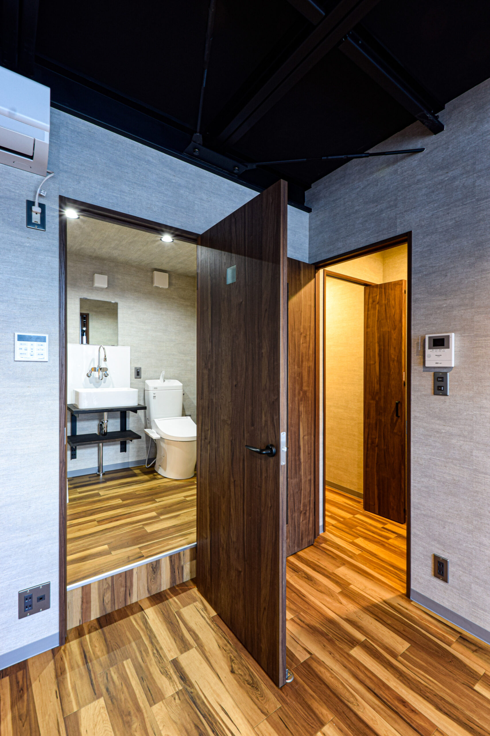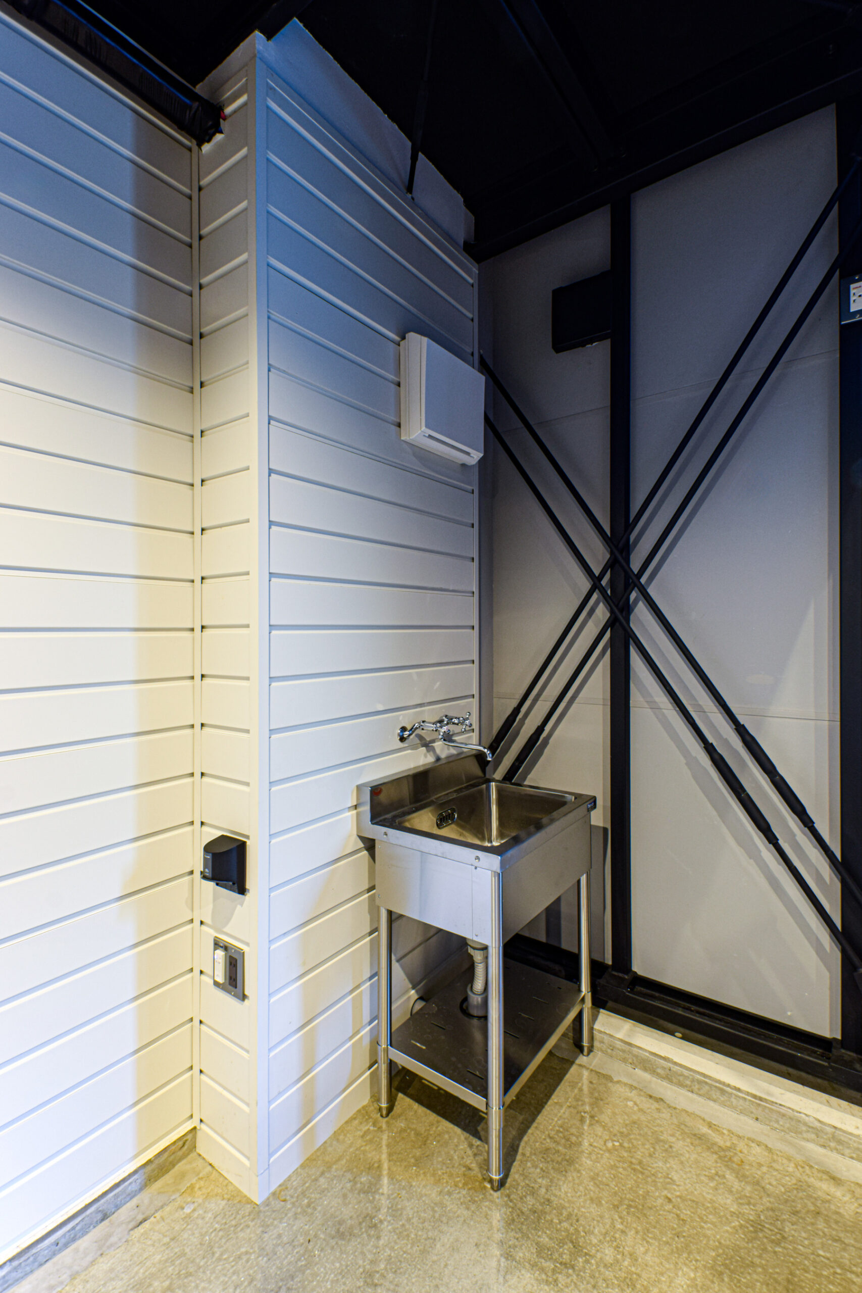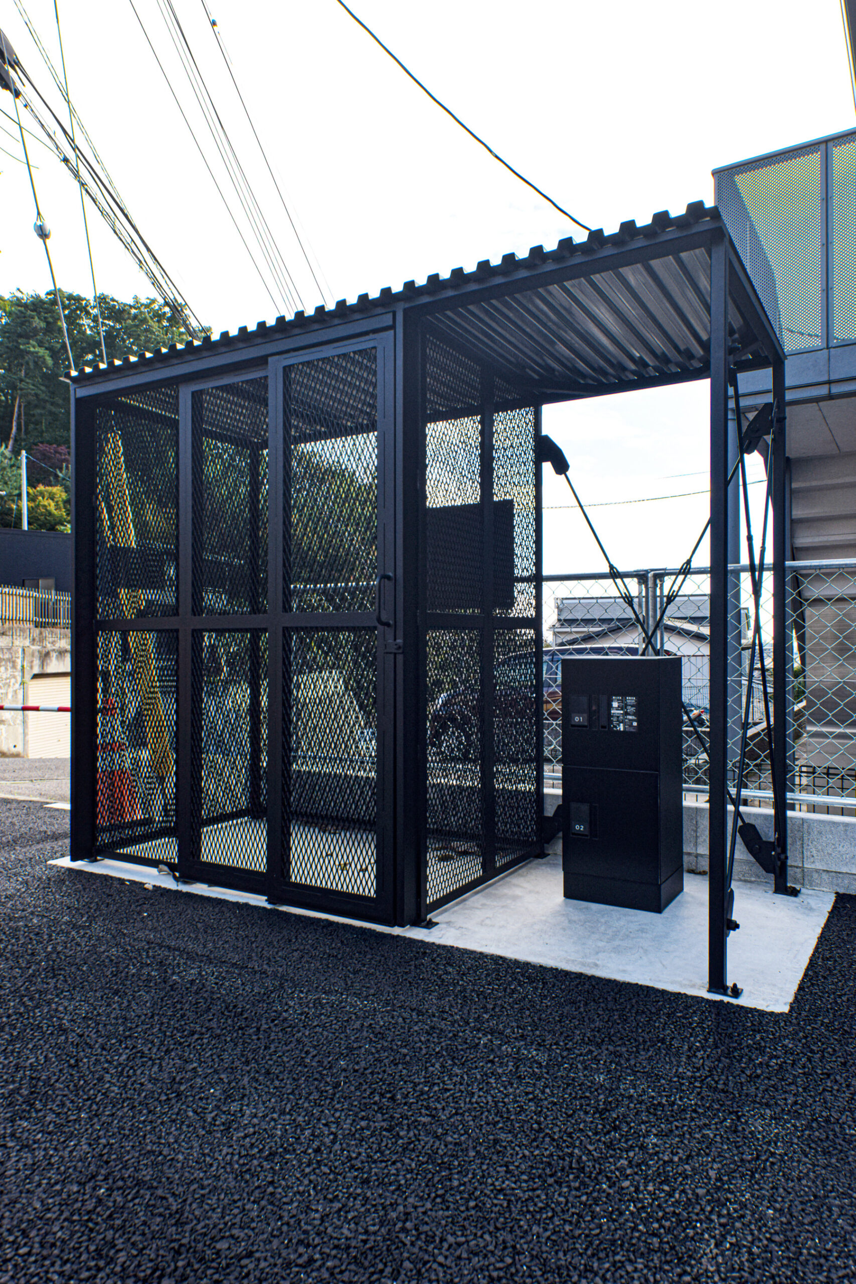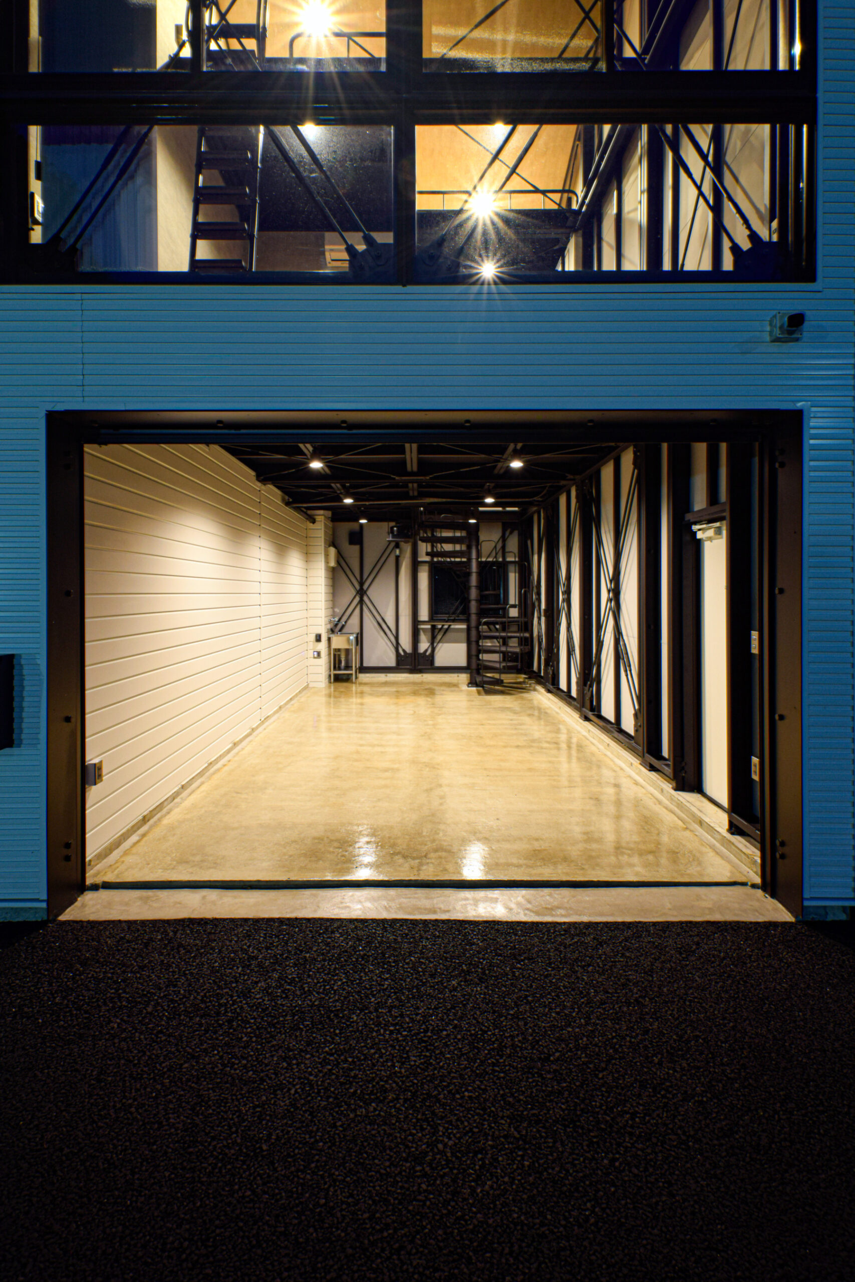 また向かって右側の1号室は、2×4スパンをベースに玄関ドアをサイド面に設置することで、幅広のシャッター開口を確保。これによりランクルやゲレンデ、最新のハイパーカーなど、車幅が2mを超える車両でも出し入れしやすくなっているのが特徴です。