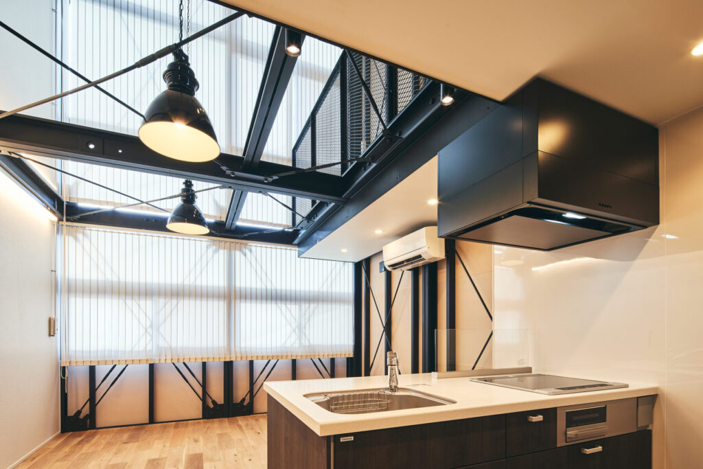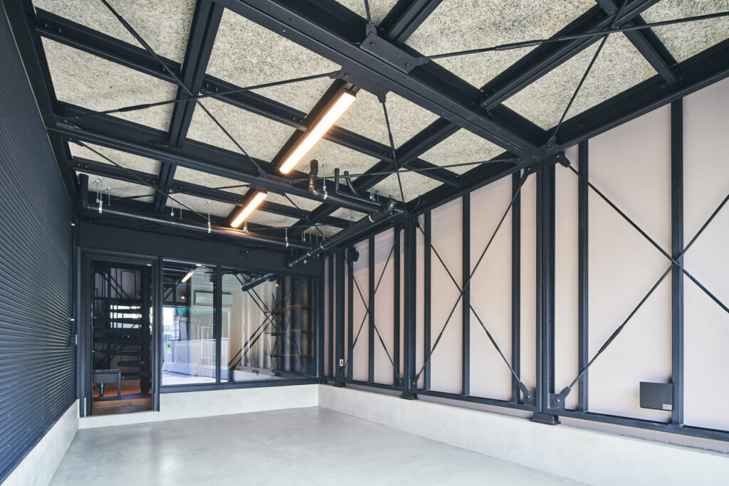 1階部分は、GLBシリーズの象徴でもある鉄骨現しの天井・柱が生む無骨なインダストリアル空間。クルマ・バイクの格納はもちろん、ガレージピットやカスタムスペースとしても最適。さらに、DIYスペースやアトリエといった用途にも対応可能な構造となっており、まさに“使い倒せる空間”となっています。
