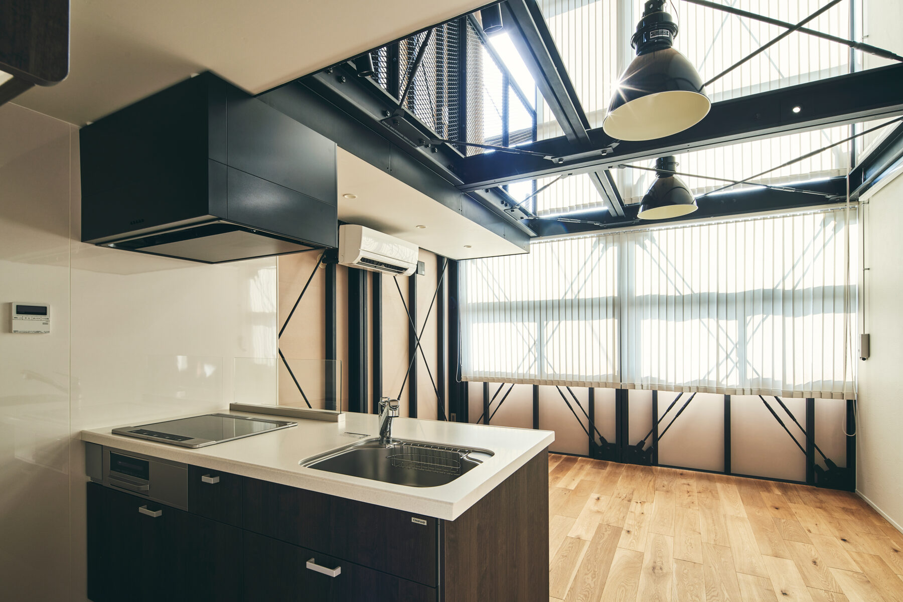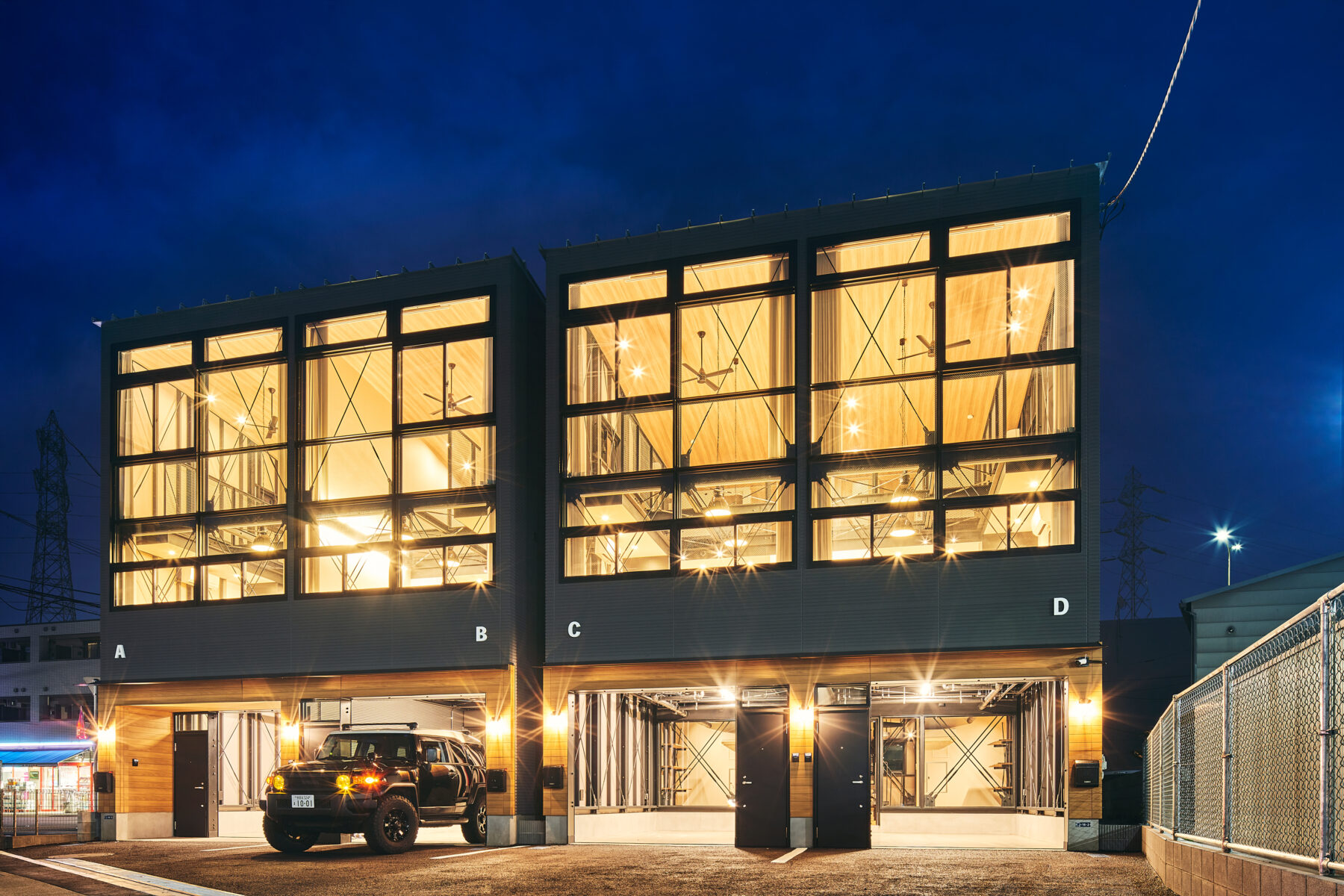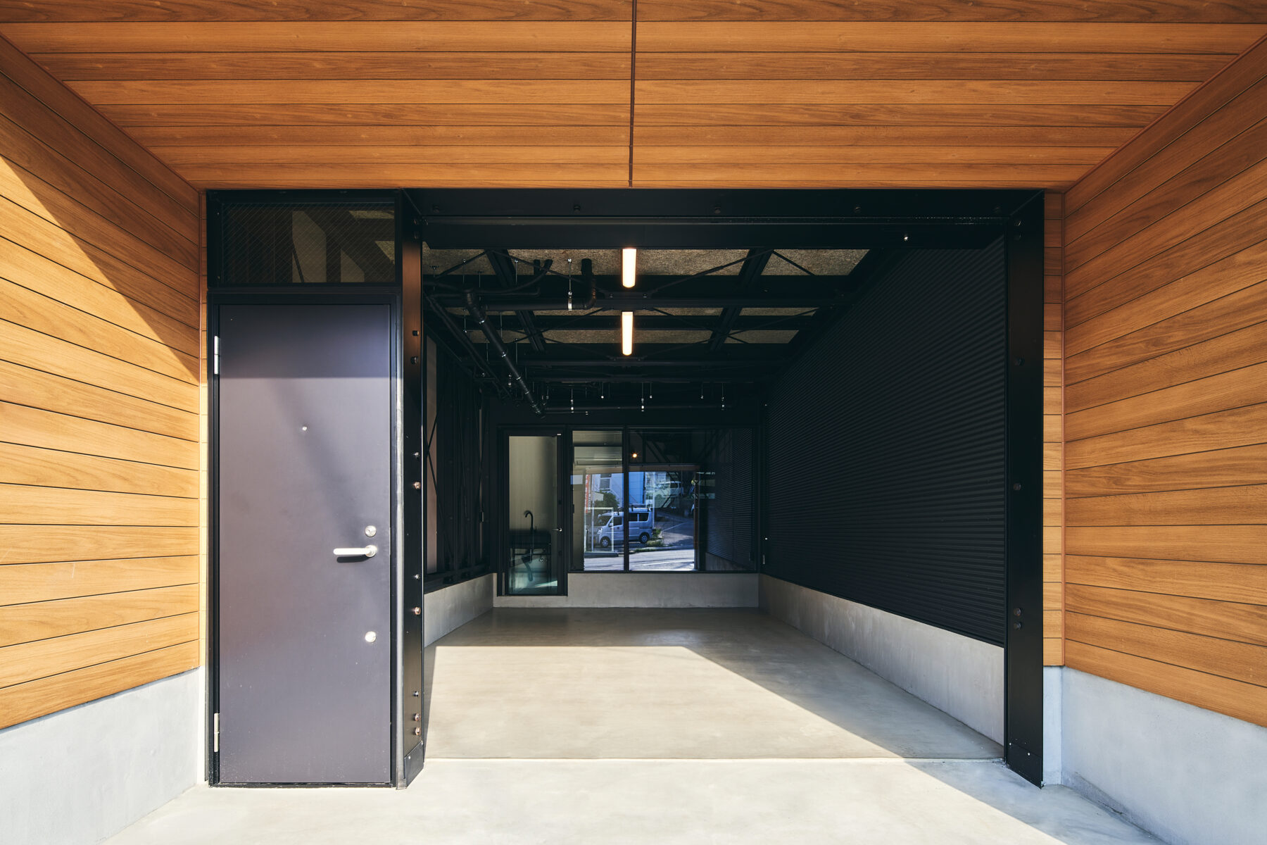 この建物は、通常の2×4スパンよりも奥行きが1スパン分長い2×5スパン構成で、ガレージスペースと居住空間を緩やかに隔てるガラスパーテーション付きエントランス&ワークスペースを設けた、唯一無二の“都市型ガレージハウス”です。