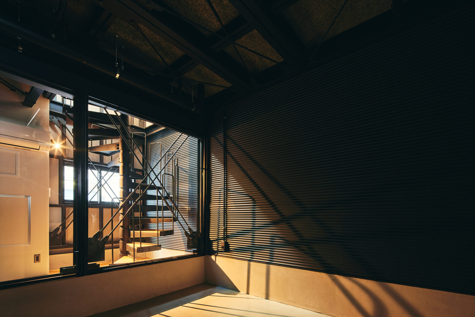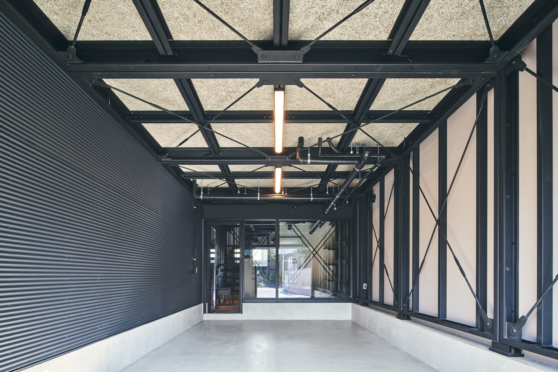 通常より奥行きのある2×5スパンのガレージ空間。ガレージと住空間のあいだに1スパン分を確保し、ガラスパーテーション越しに玄関兼ワークスペースを設けた、モーターフリークには堪らない空間です。