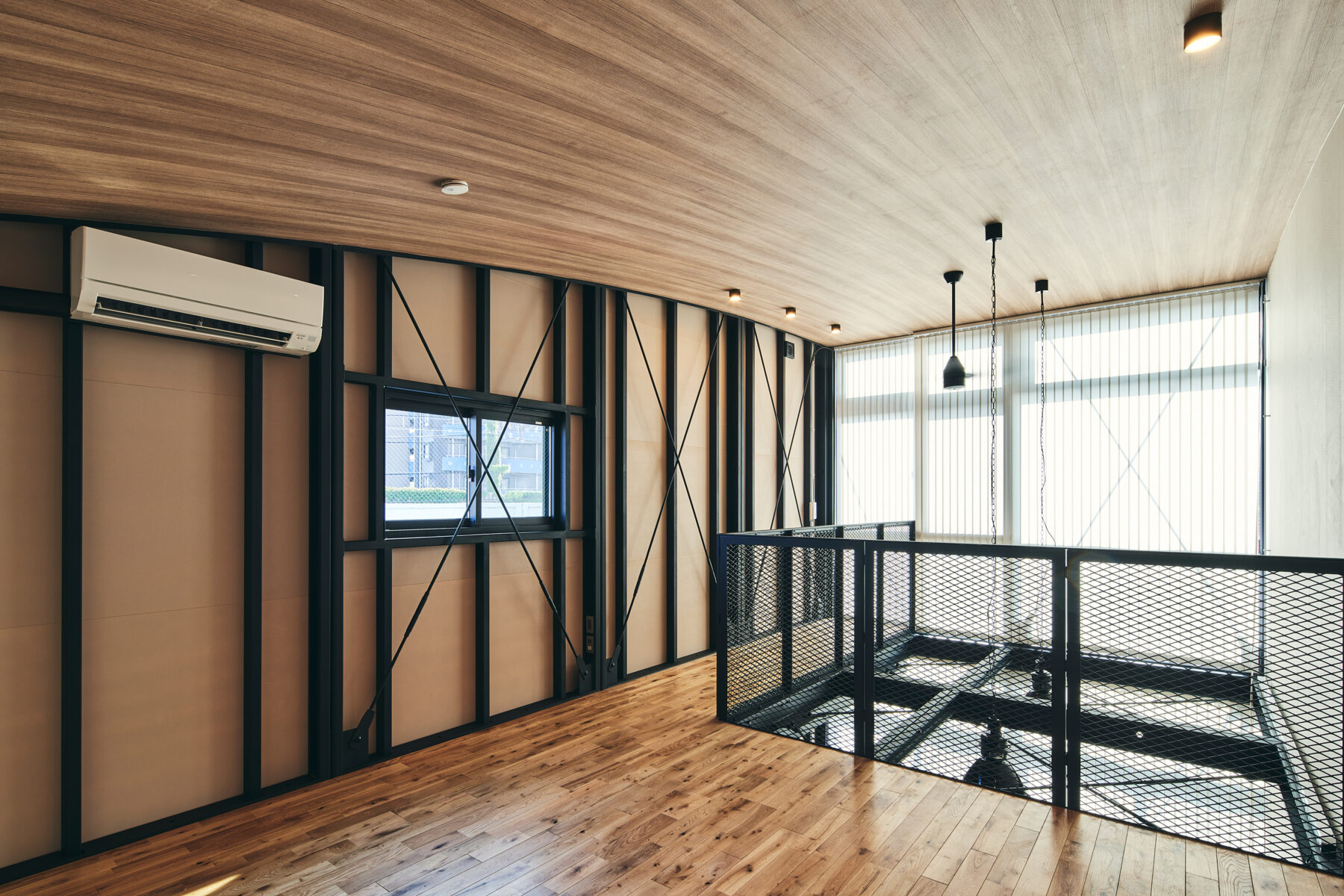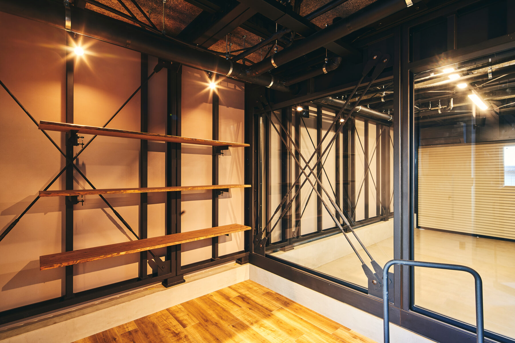 1階部分は、GLBシリーズの象徴でもある鉄骨現しの天井・柱が生む無骨なインダストリアル空間。クルマ・バイクの格納はもちろん、ガレージピットやカスタムスペースとしても最適。さらに、DIYスペースやアトリエといった用途にも対応可能な構造となっており、まさに“使い倒せる空間”となっています。