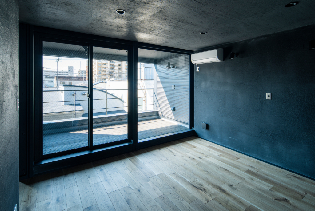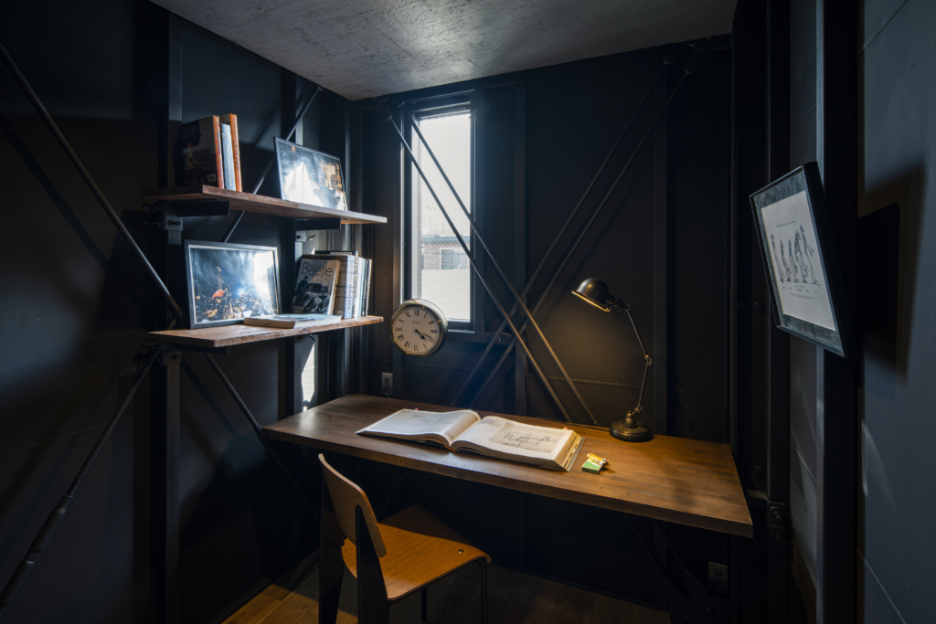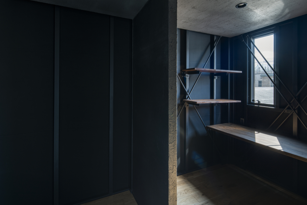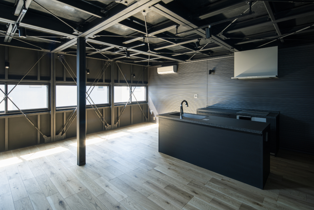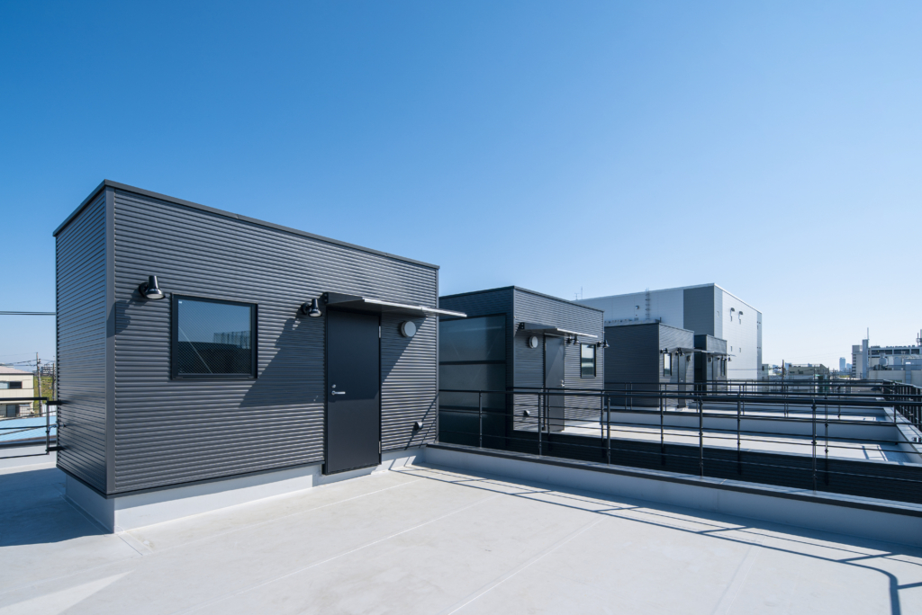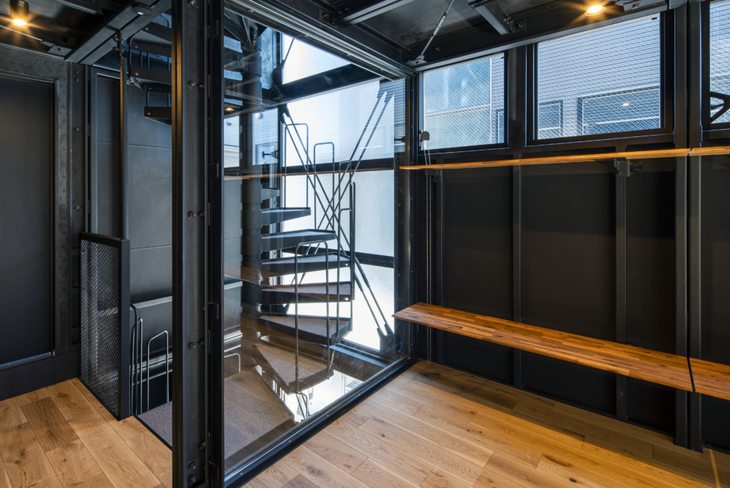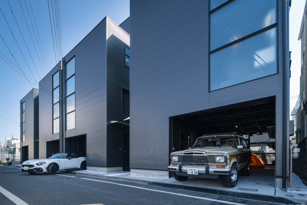 1Fに縦並びで大型車が2台駐車できるガレージスペースを持つ戸建て賃貸住宅4戸です。クルマ好きにとっては最高の仕様。鉄骨が露出したスタイリッシュなガレージは、他の追随を許さない希少性。秀逸なデザインの趣味車や、大切に保存されたクラシックバイク等が、硬質なガルバリウム外壁の前にずらりと並ぶ姿は、考えただけでもワクワクします。