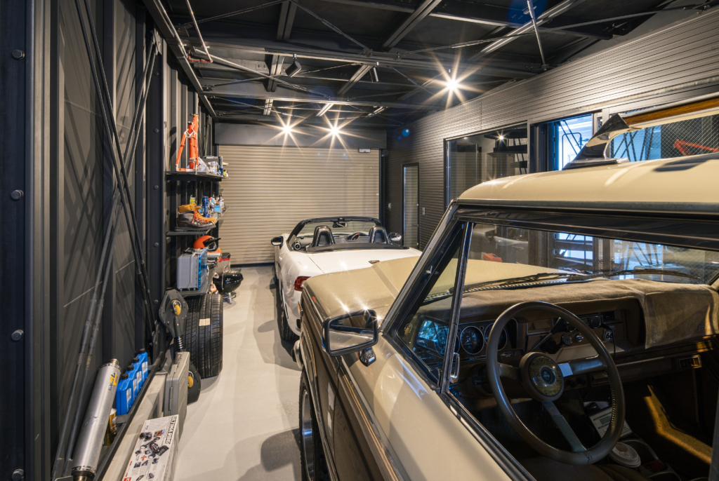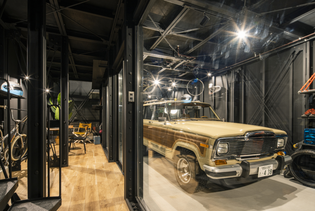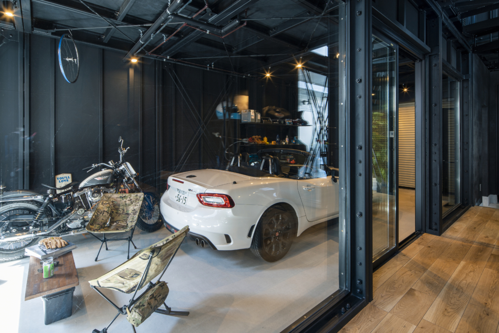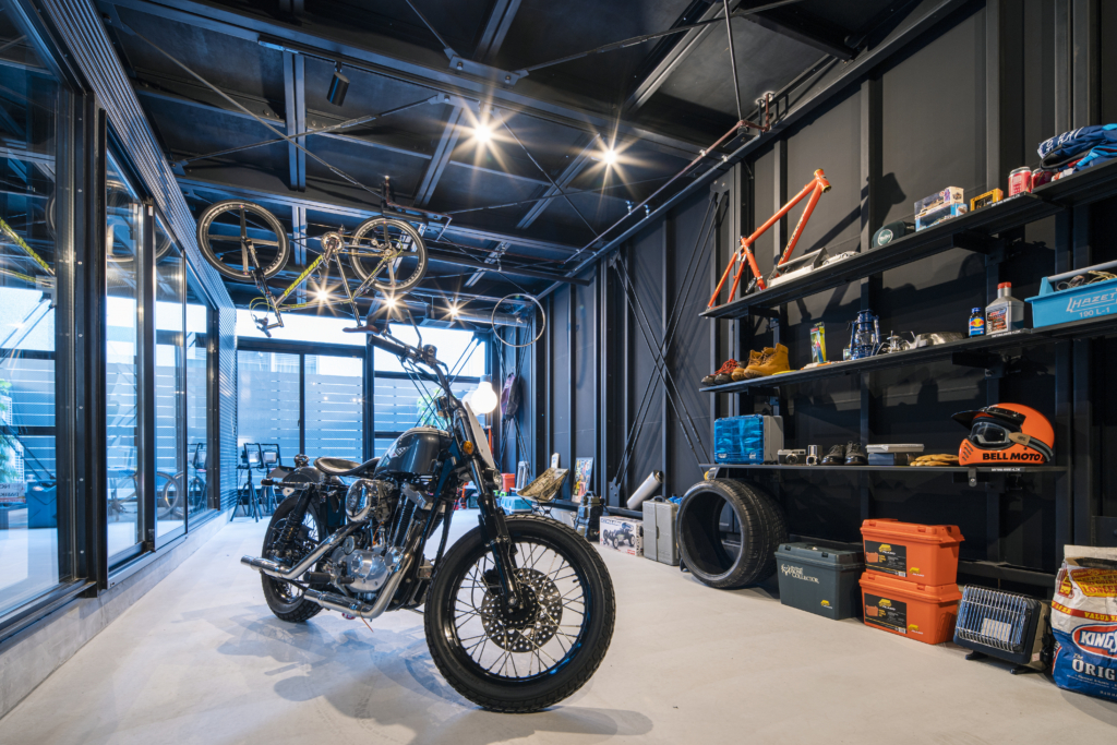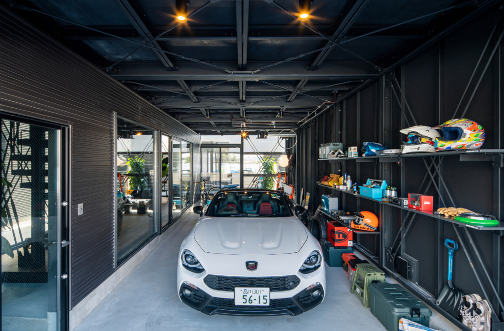 賃貸住宅でこの格納スペースは必要にして十分。隣家との間のプライベートな庭に面して、FIX開口も設定して、非常に開放的なガレージになっています。クルマ、バイク、アウトドアギア類の比率は自由自在。天井に吊るす収納も含め、思う存分自分の世界が演出できるのです。
