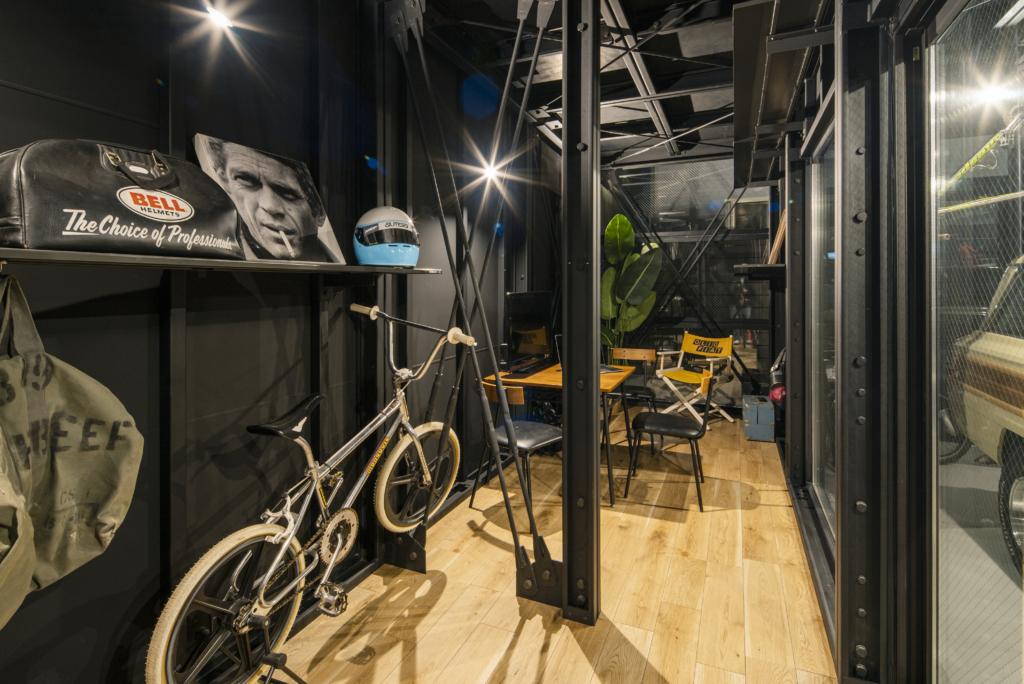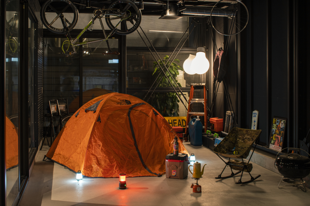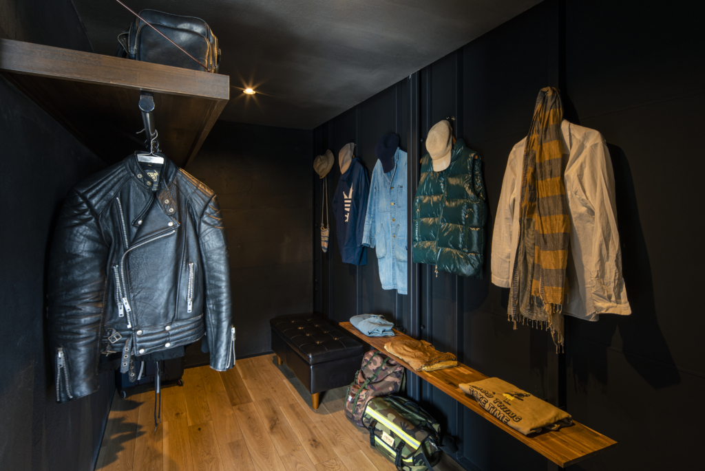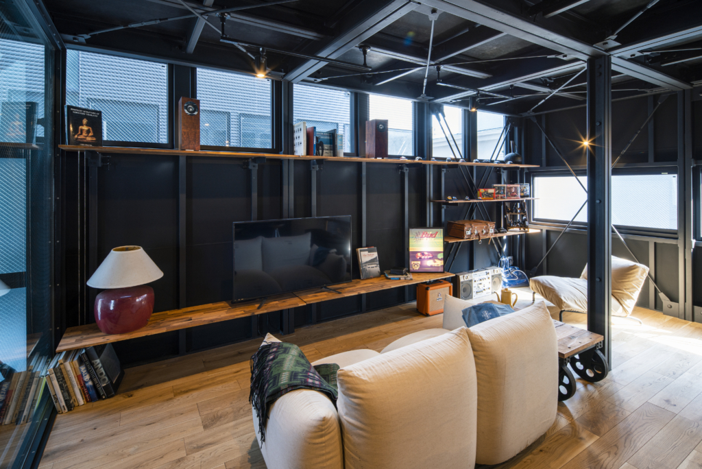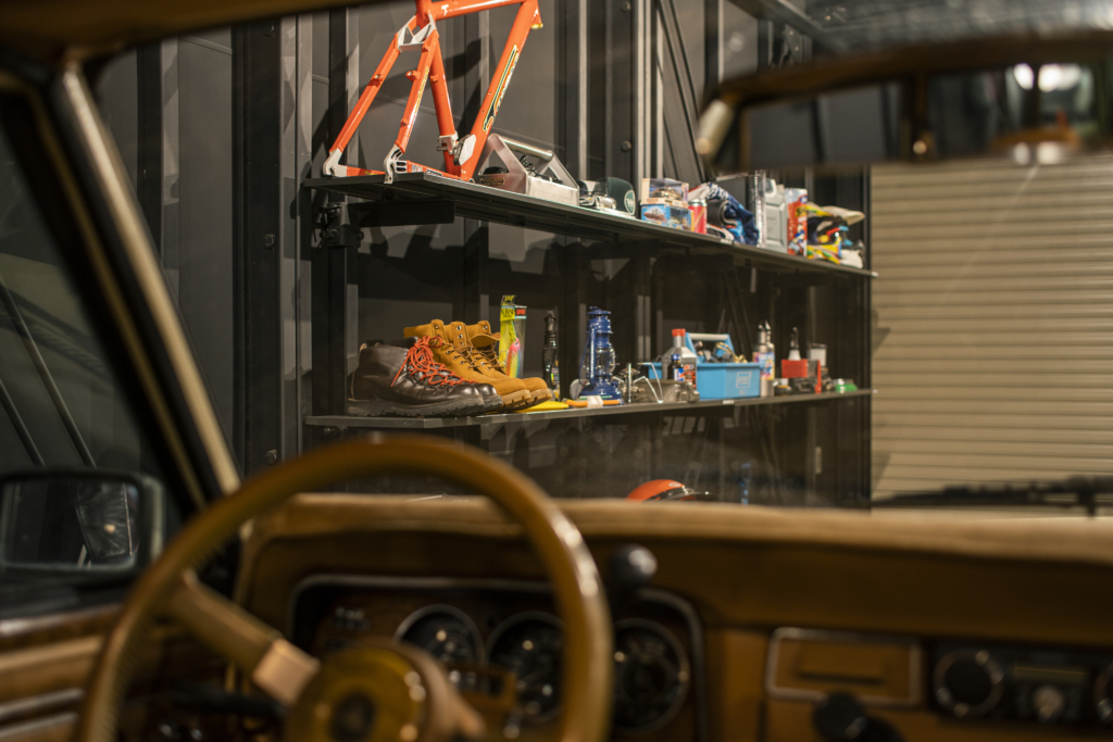 賃貸住宅でこの格納スペースは必要にして十分。隣家との間のプライベートな庭に面して、FIX開口も設定して、非常に開放的なガレージになっています。クルマ、バイク、アウトドアギア類の比率は自由自在。天井に吊るす収納も含め、思う存分自分の世界が演出できるのです。