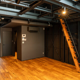 ラフな鉄骨と無垢床のコントラストが心地よい約31㎡の2F空間。趣味のギアや観葉植物が似合う、“自分らしさ”を形にできるワンルーム構成です。