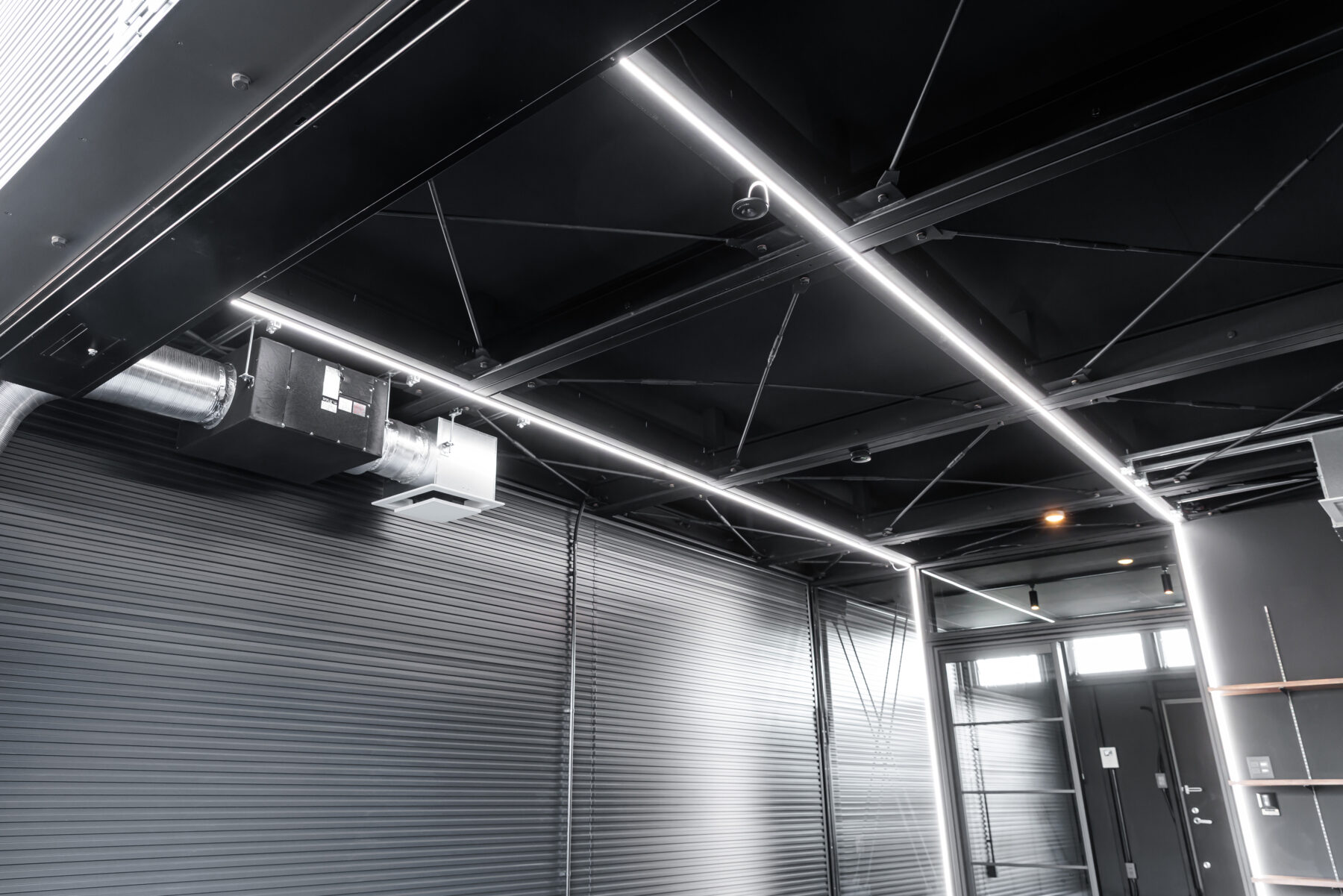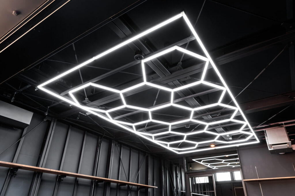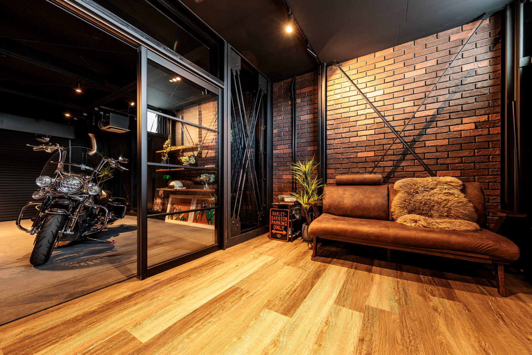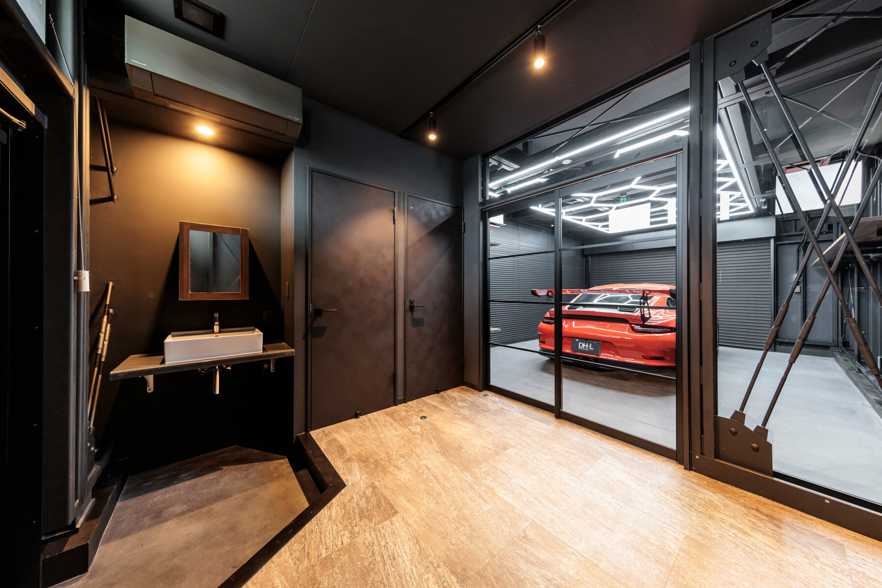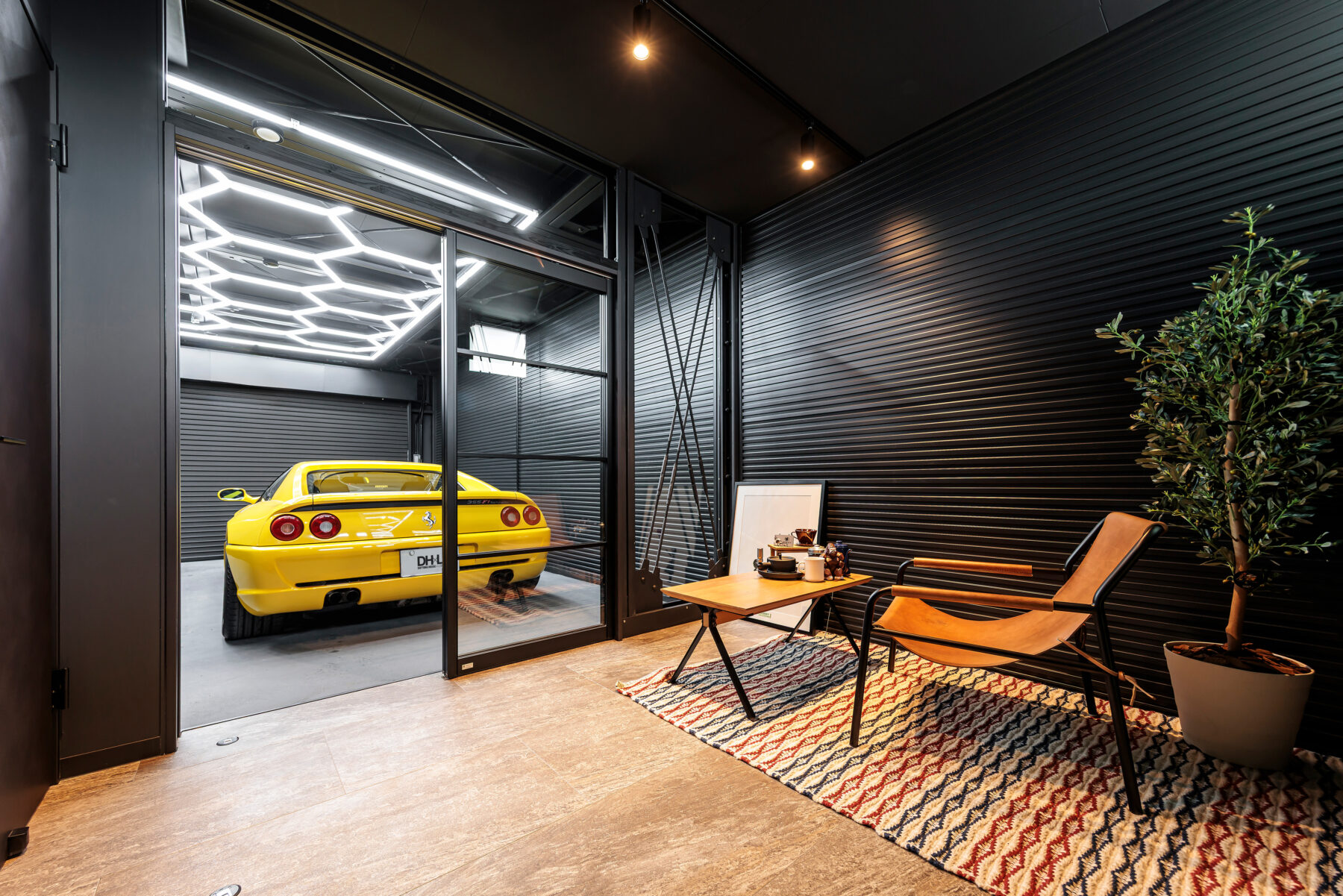 一部の区画には、愛車をドラマチックに演出するハニカムライトやLEDバーライトを採用。ホビールームとの間はガラスで仕切り、空間を分けながらも愛車の存在を常に感じられる設計です。