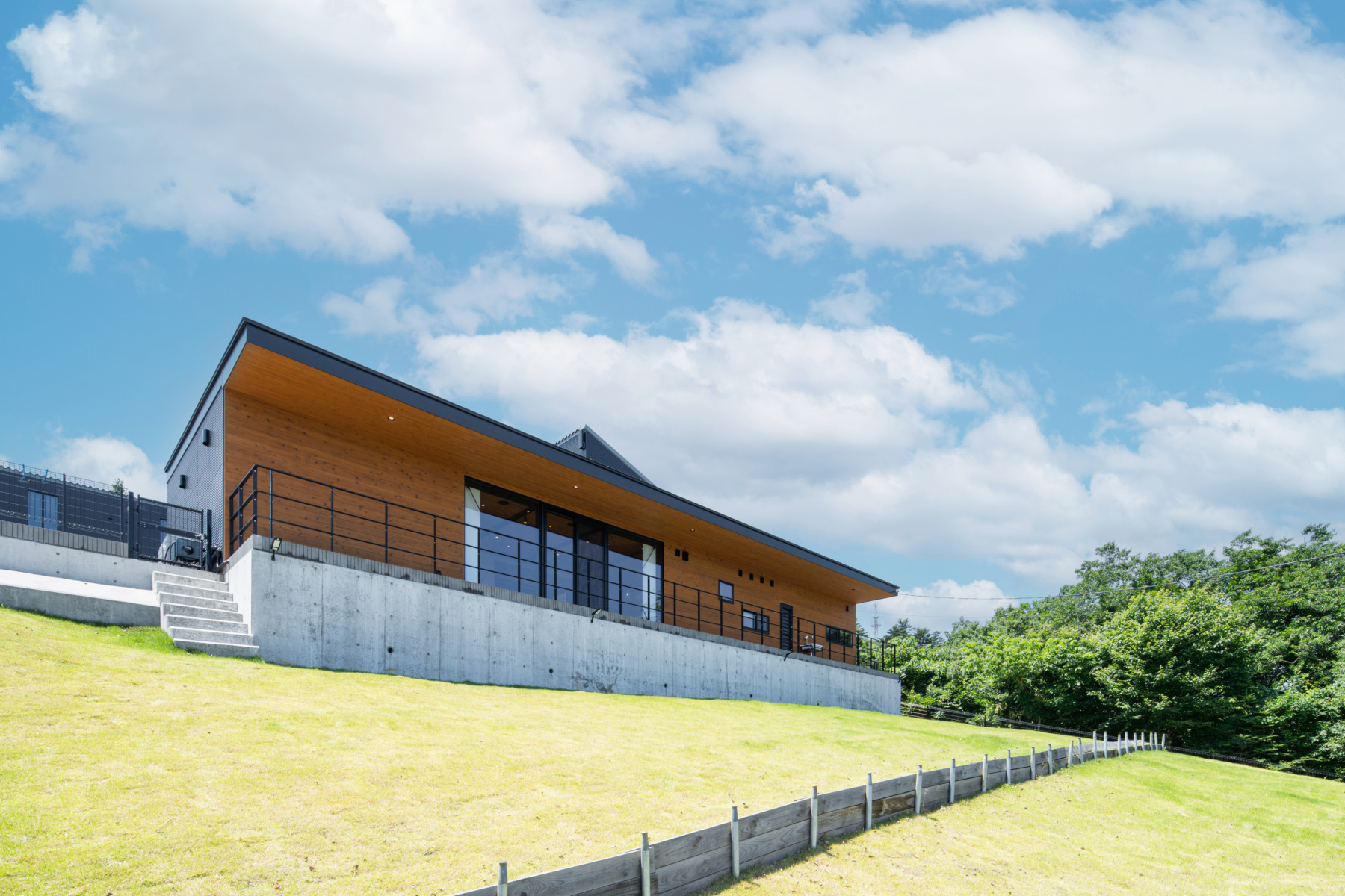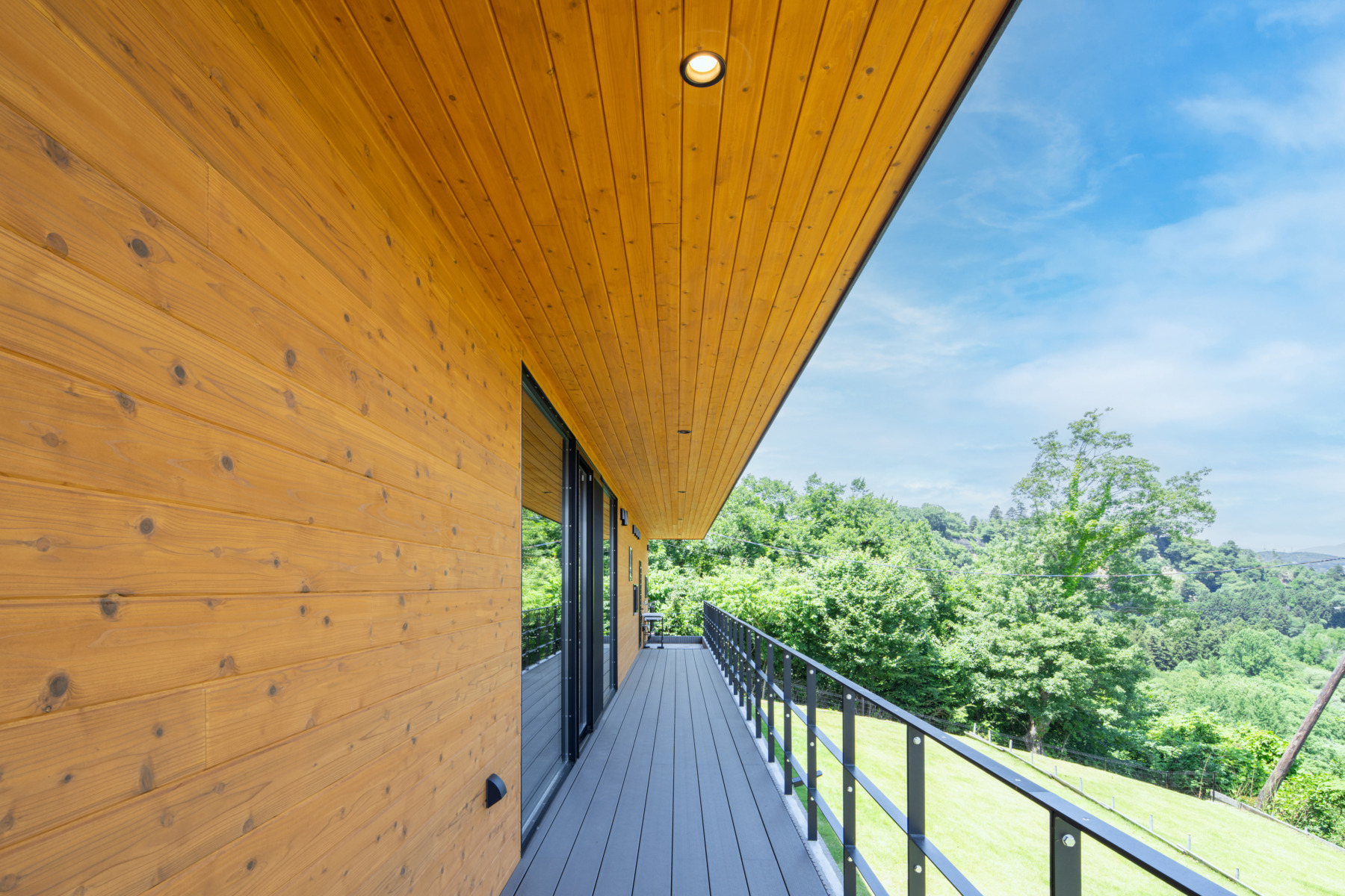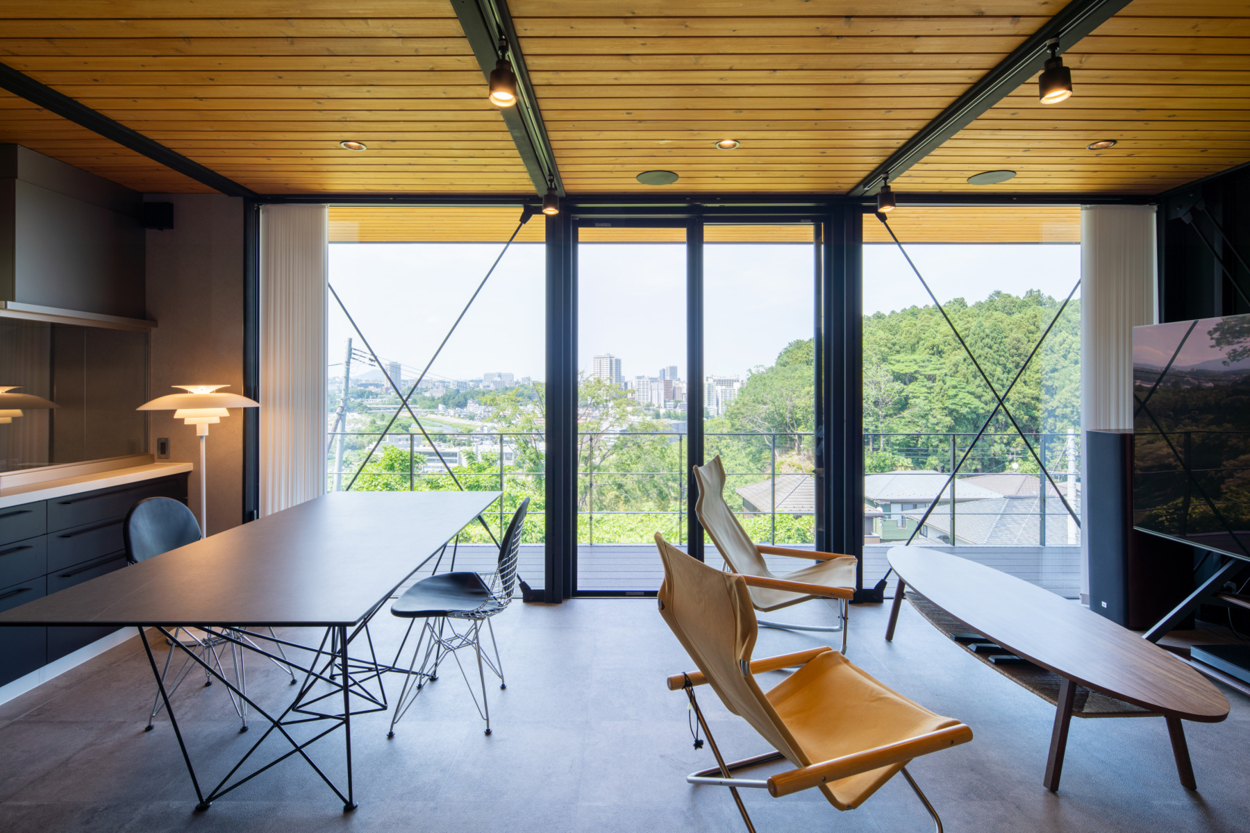 3住戸と4住戸のGLBとTYPE-Fからなる向山GLB。GLBからの眺望を妨げないように設計されたTYPE-Fは、デッキと庇を斜面側にせり出して建築。これによりピクチャーウィンドー効果が生まれ、毎朝カーテンを開けるたびに迫力満点の絶景が全面に広がります。