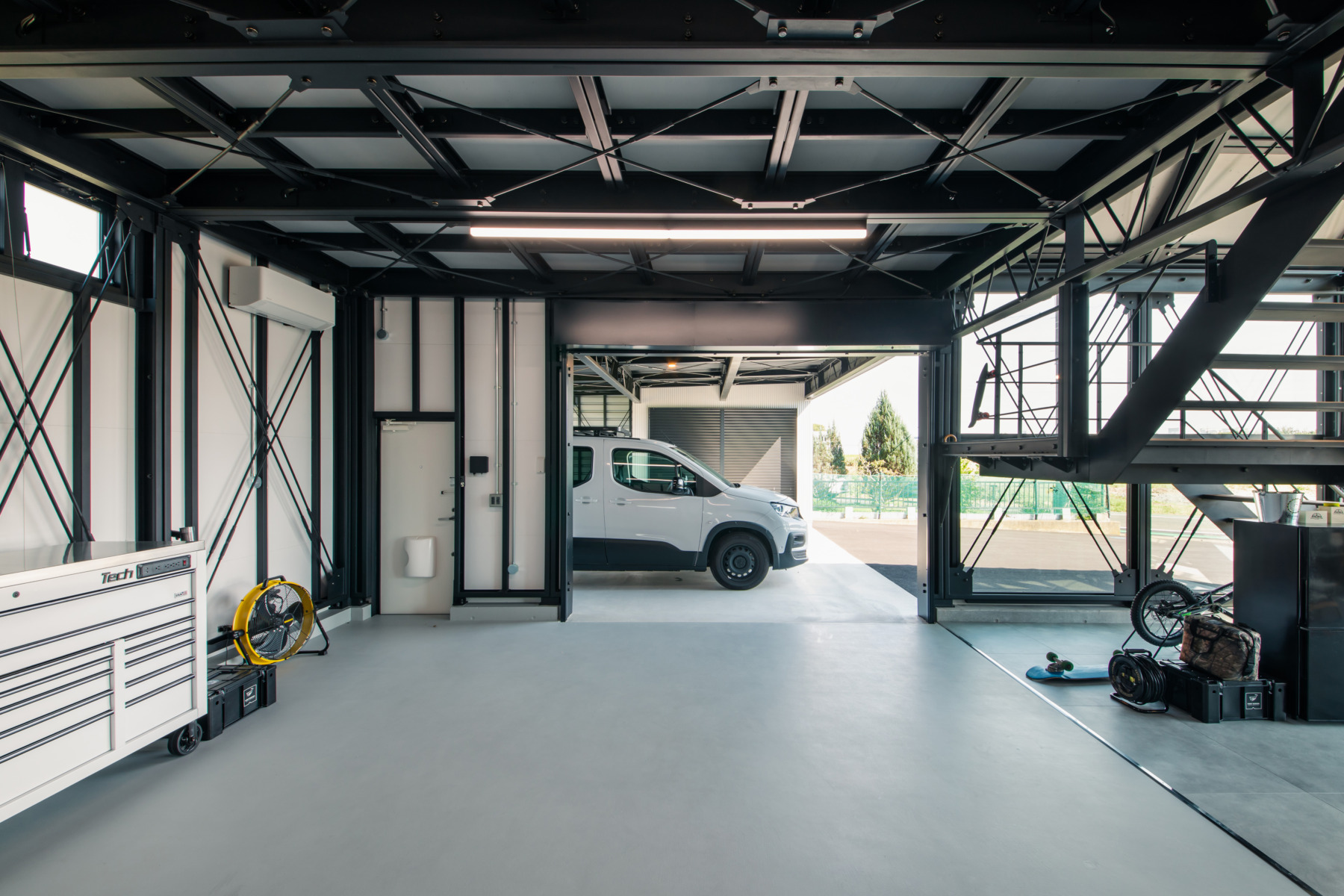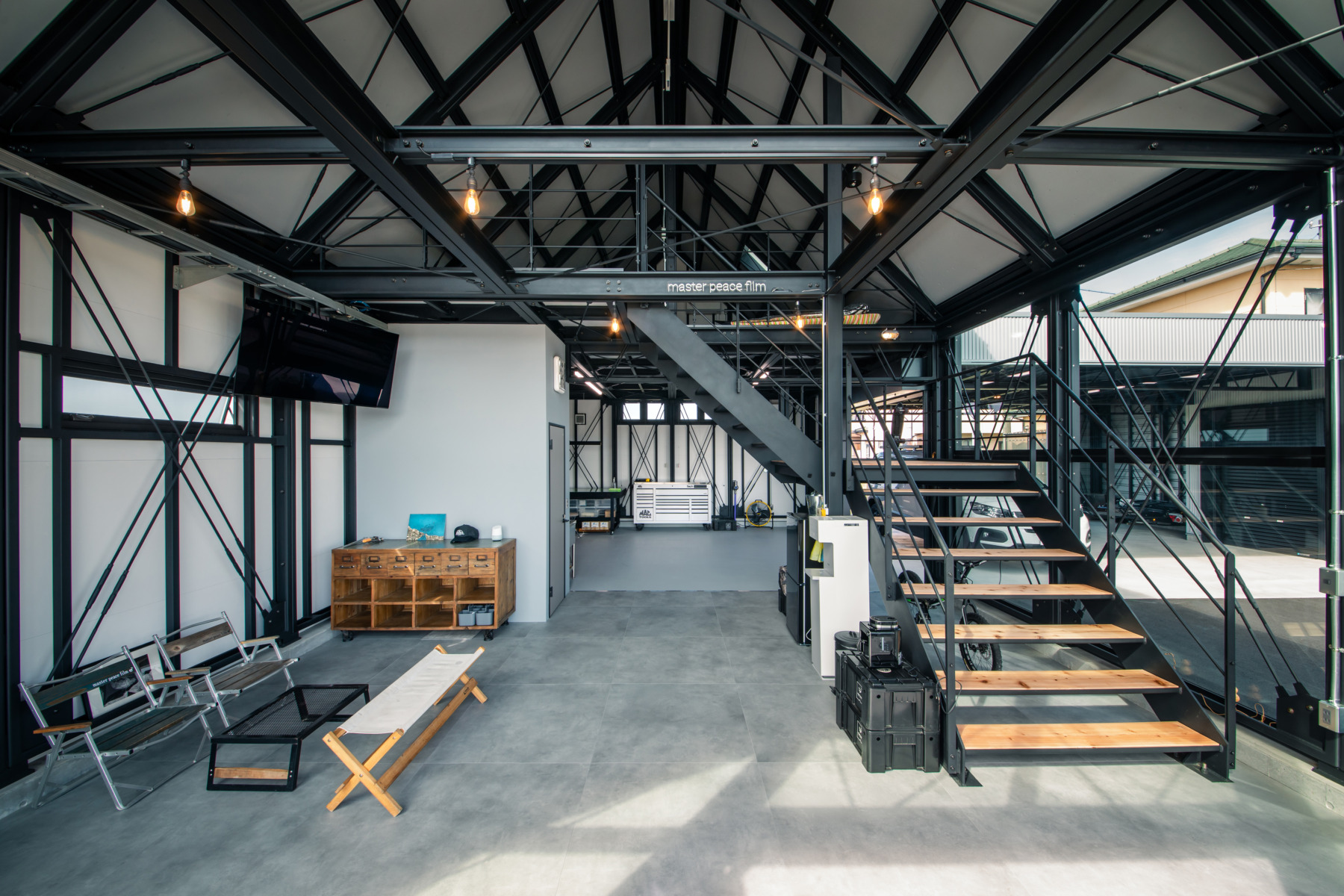 ガラス張りのファサードが存在感を際立たせ、鉄骨あらわしの室内はまさにインダストリアル感溢れる、これぞデイトナハウスと呼べる空間です。