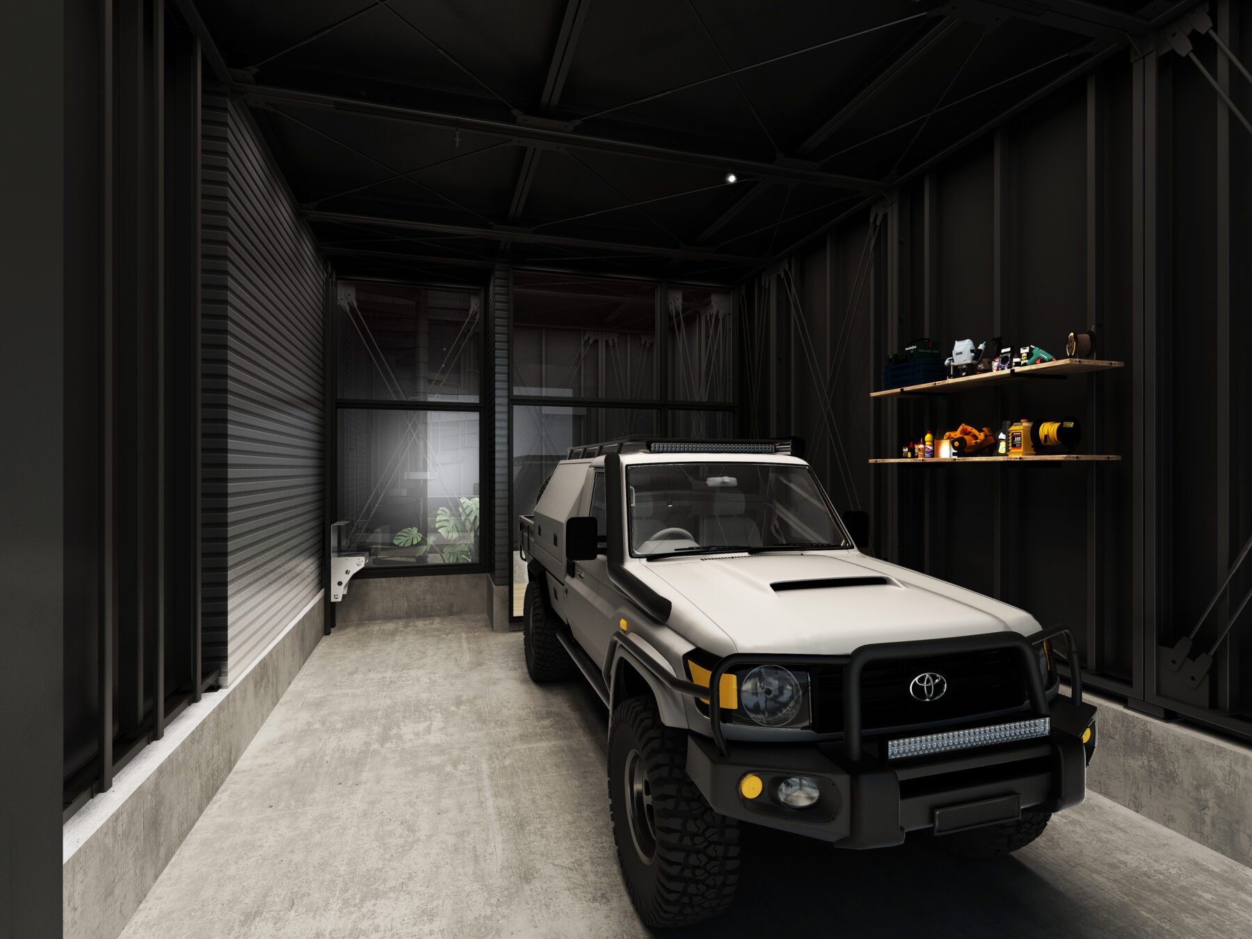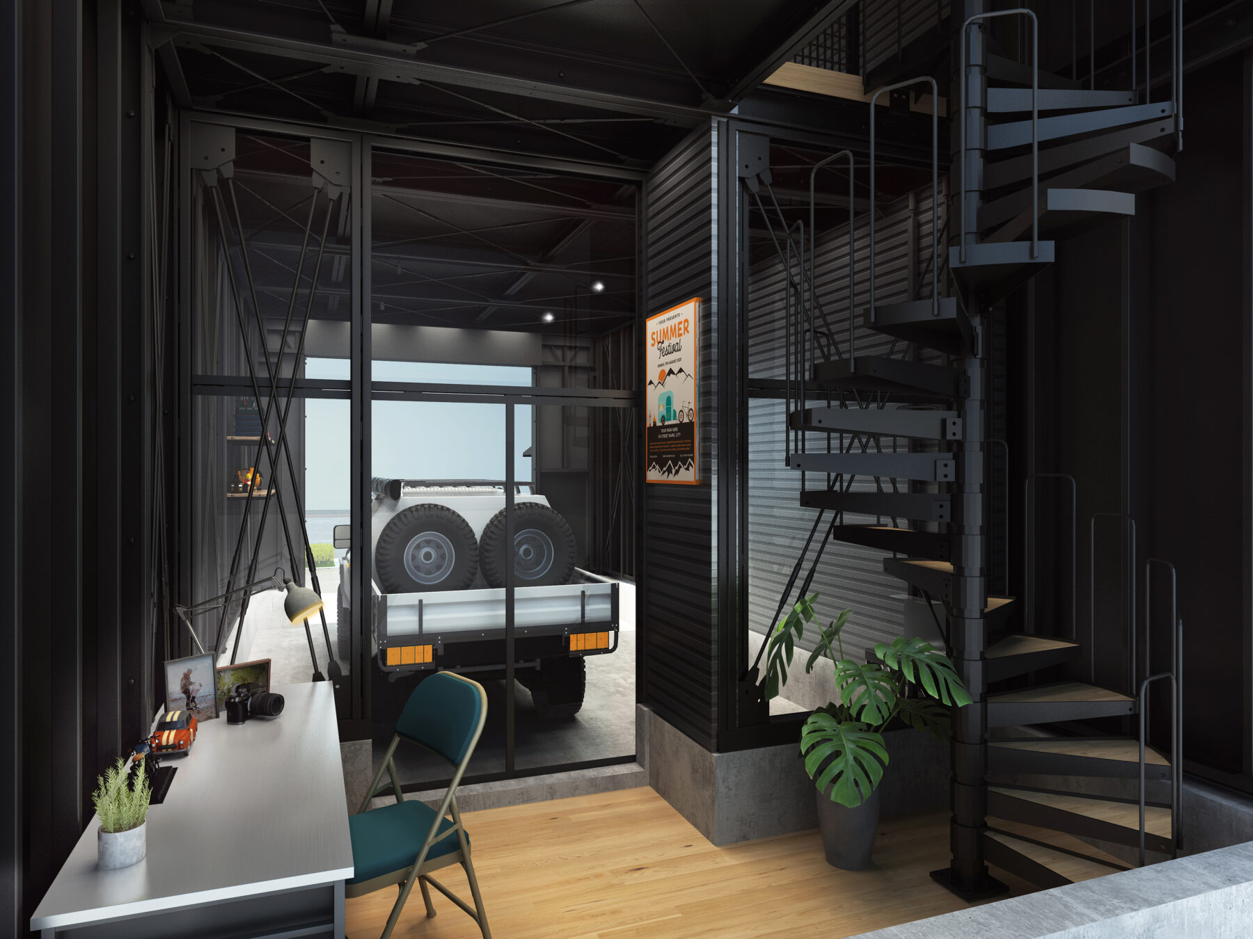 本物件の最大の特徴は、天井高約3.6mを確保したガレージスペース。ルーフラック付きのハイエースやSUVもゆとりをもって格納できます。さらにガレージ奥には、独立した書斎やホビールームとして使えるスペースを設け、“趣味と仕事を使い倒す”ための実用性を備えています。