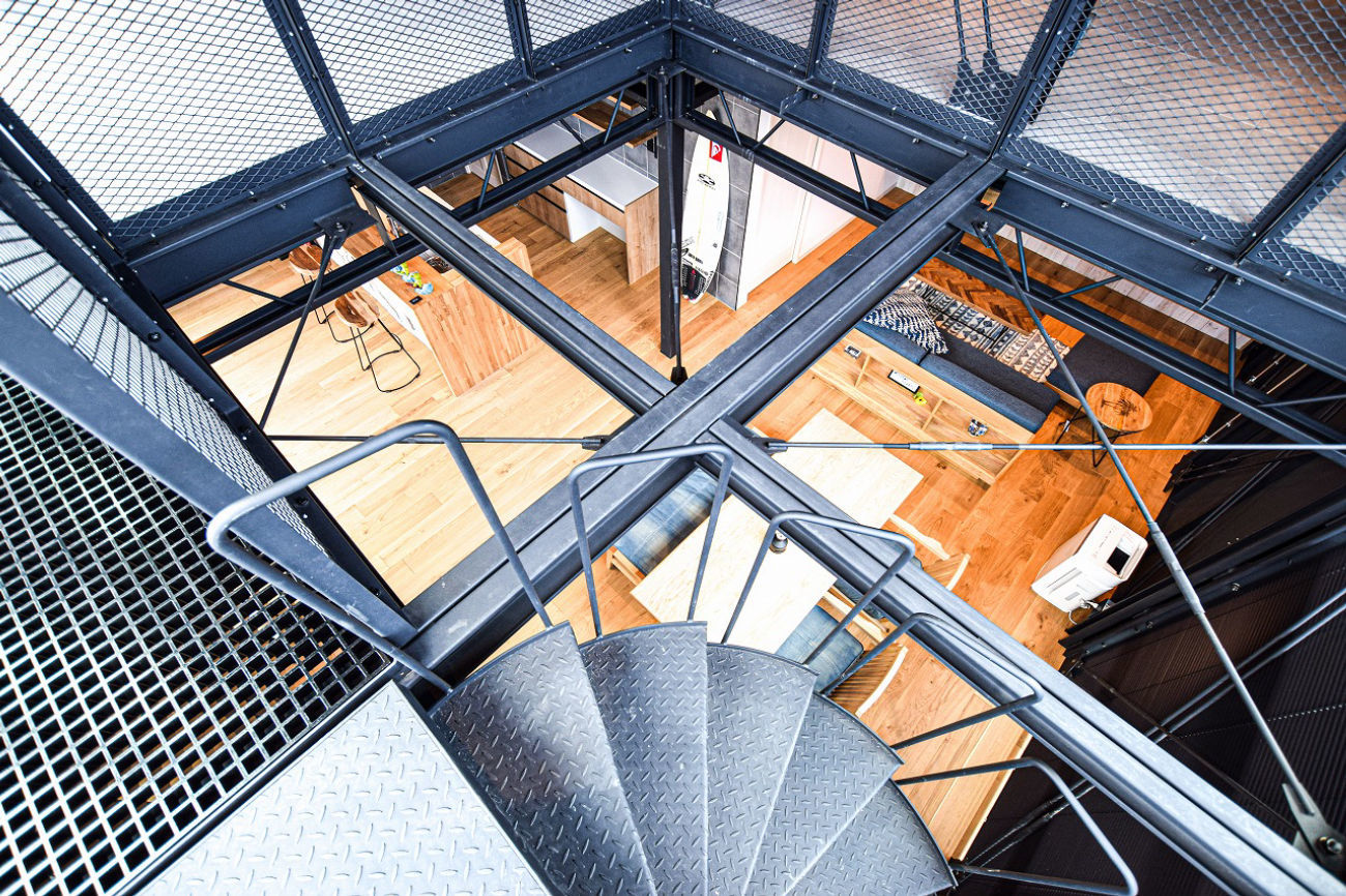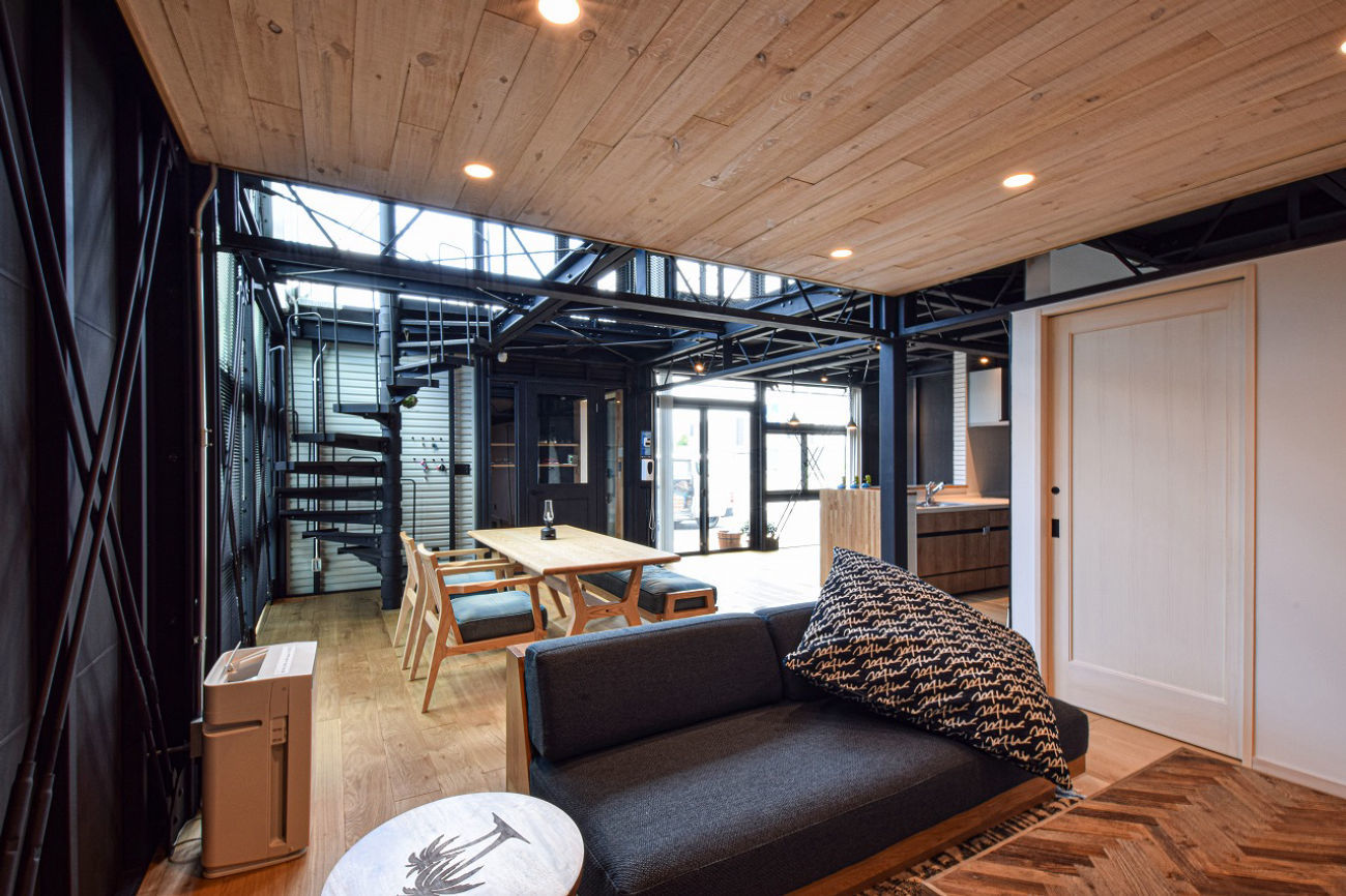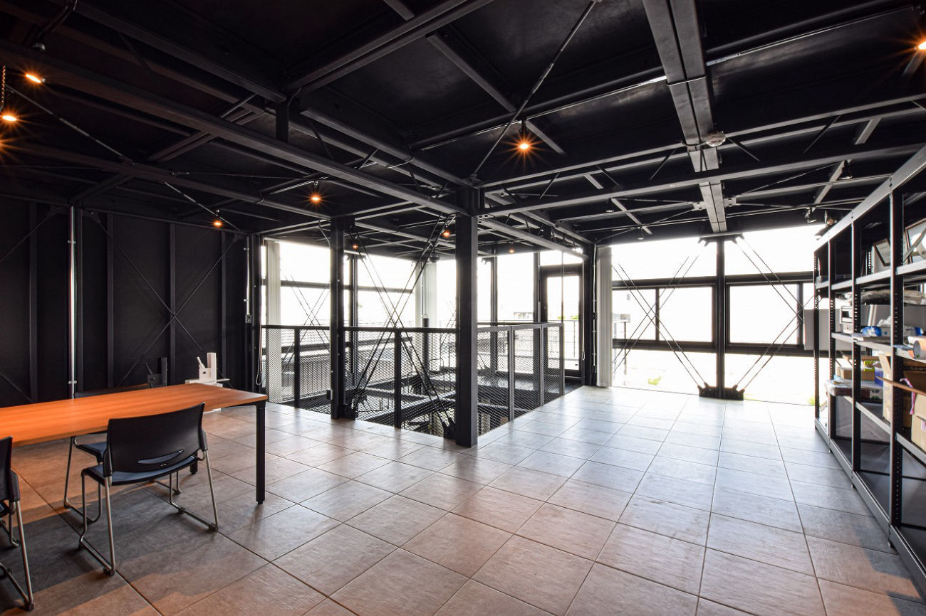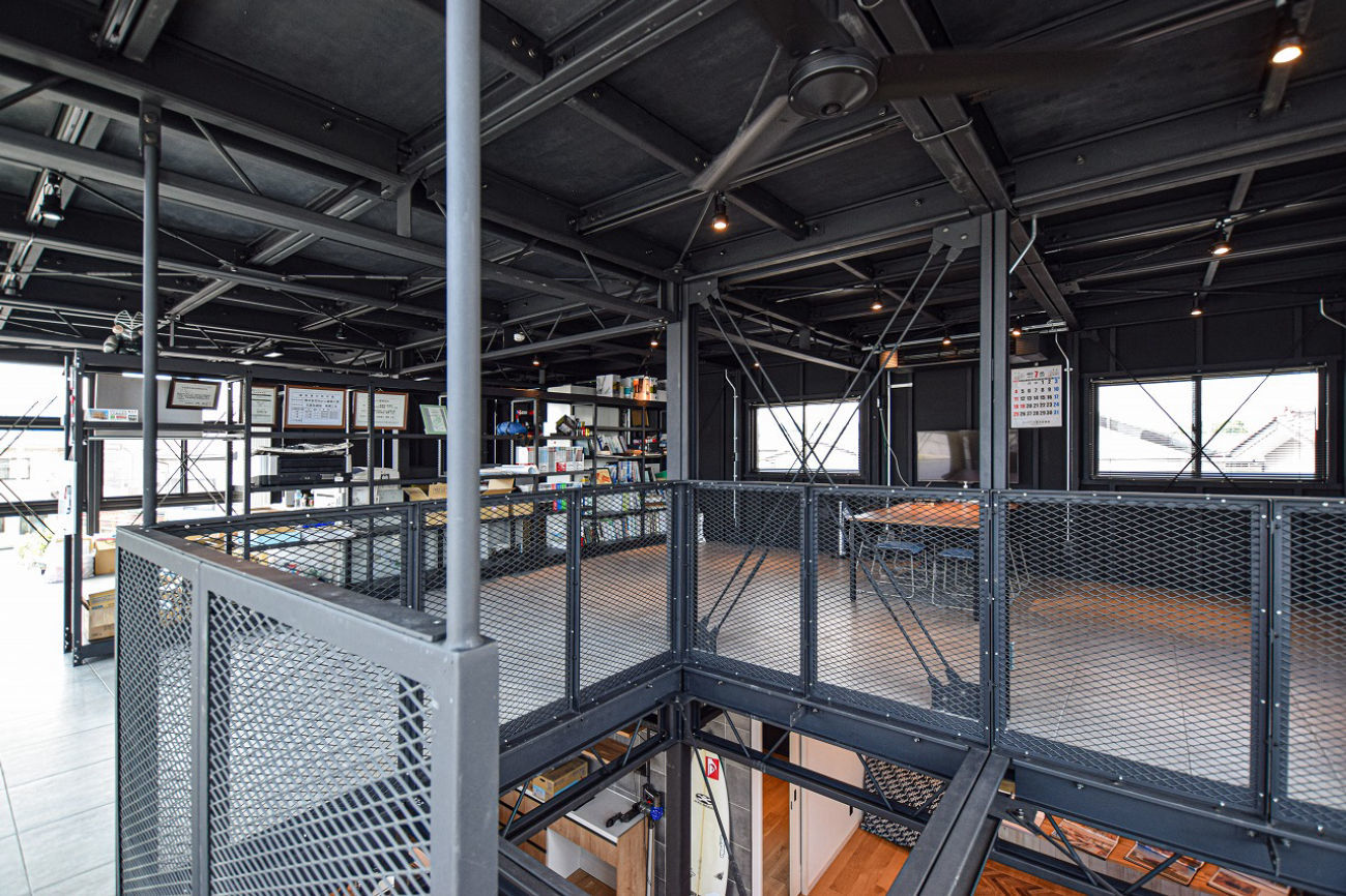 1階スペースはお馴染みの鉄骨剥き出しかつ、吹抜けを要した広いリビング&キッチン。2階はすべてを1つの空間で構成して事務所や店舗をイメージする空間としても内覧が可能です。